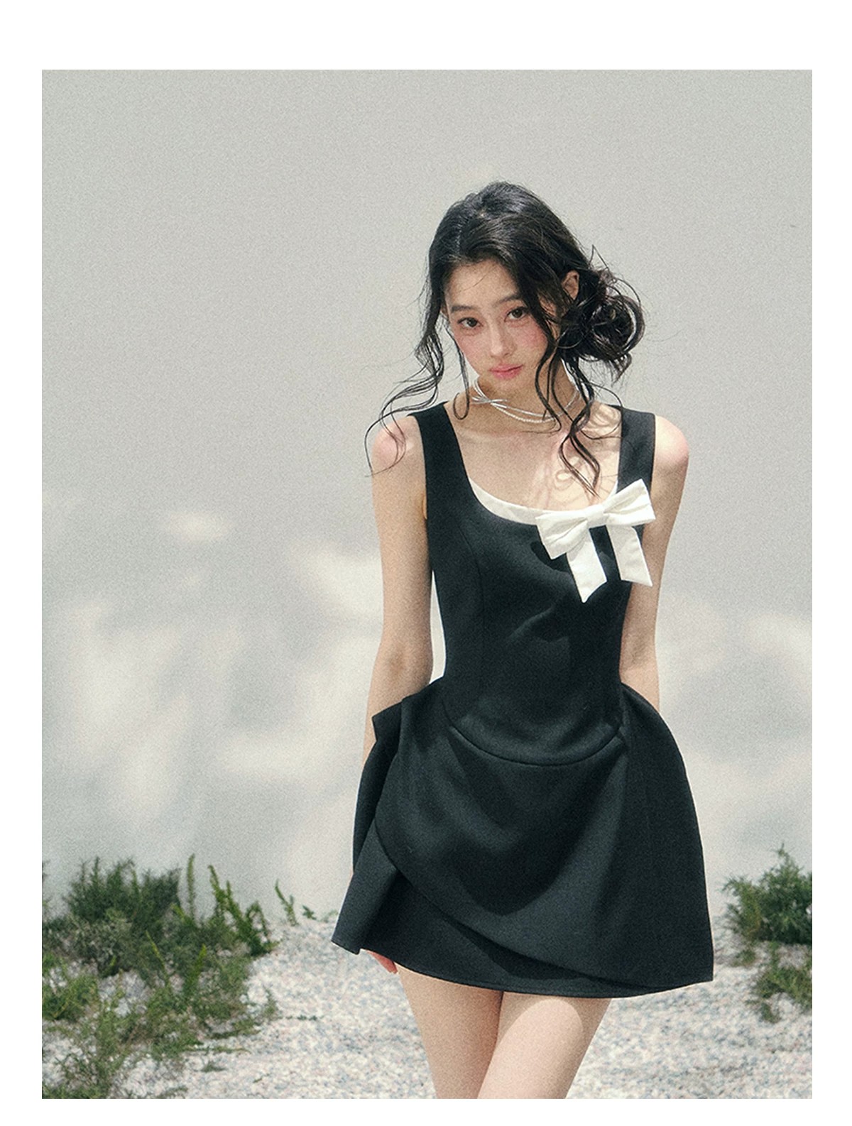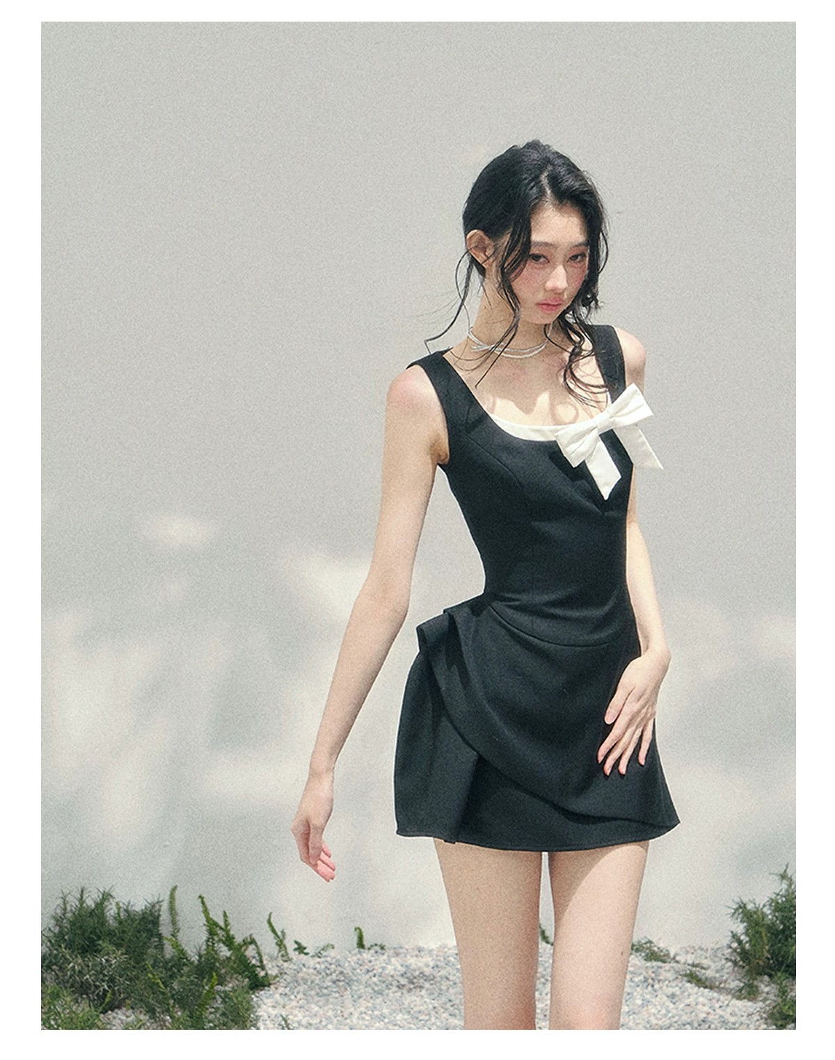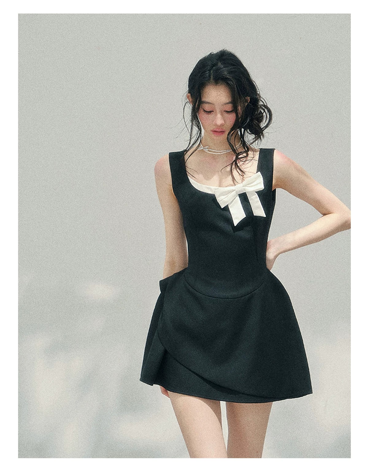 skinless 하얀 백조 프랑스식 u 칼라 진자 중간 길이 드레스 얼음 센스 높음 폭탄 허리 수축 자카드 디자인