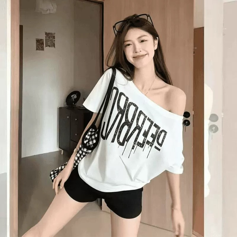 경관 그림 40 순면 220 그램 92 면 8 암모니아 Lun 비스듬한 칼라 오프숄더 오프숄더 반팔 티셔츠 여성 프린트