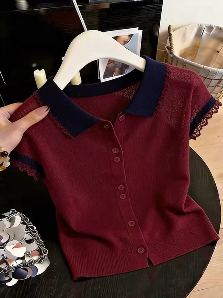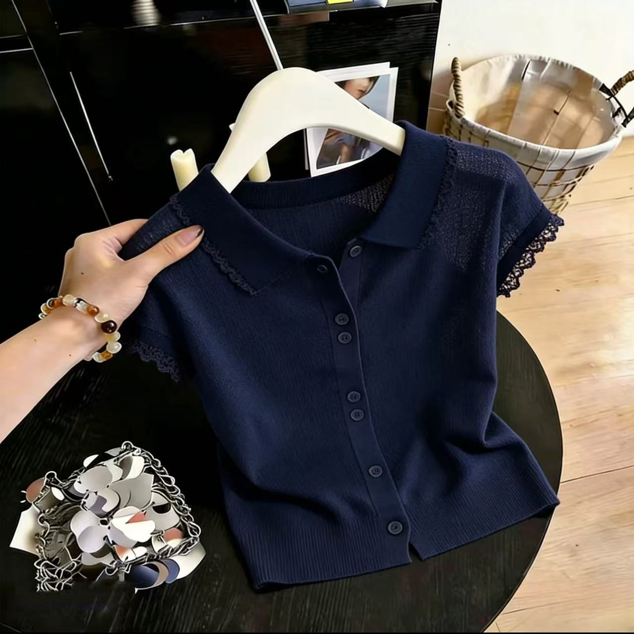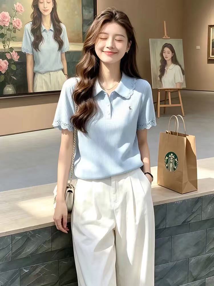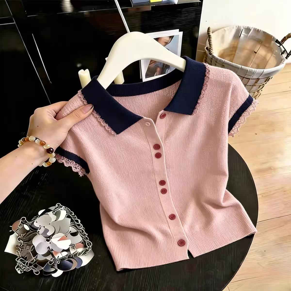 한 부서 레이스 조각 반팔 POLO 칼라 니트 스웨터 여성 2026 여름 새로운 부드러운 연령 감소 티셔츠 맨위