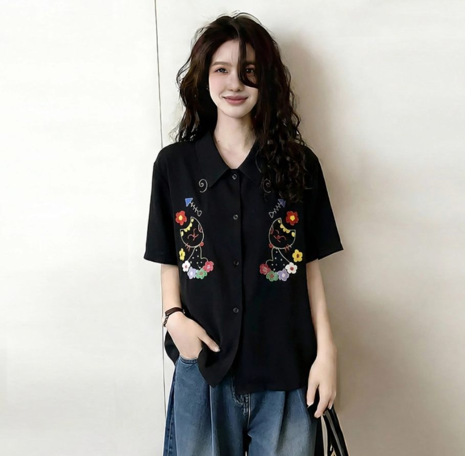 디자인 센스 새끼 고양이 자수 반팔 티셔츠 여성 2026 새로운 여름 빅 사이즈 지방 mm 표지 배 슬림해 보이는 긍정적 인 어깨 의류