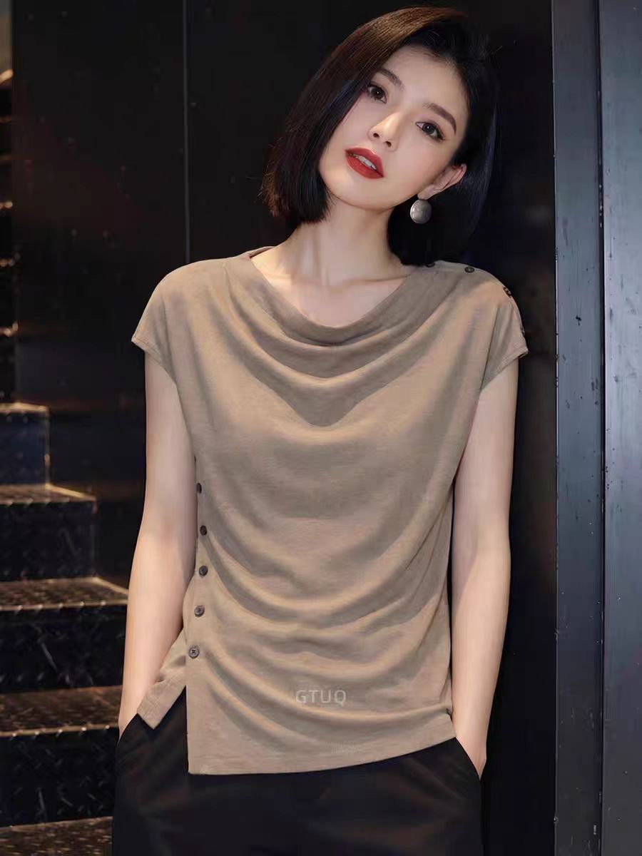 여름 Chic 불규칙 몸매 가꾸기 쇼트 스타일 긍정적 인 어깨 의류 디자인 센스 카키 색 반팔 티셔츠 여성
