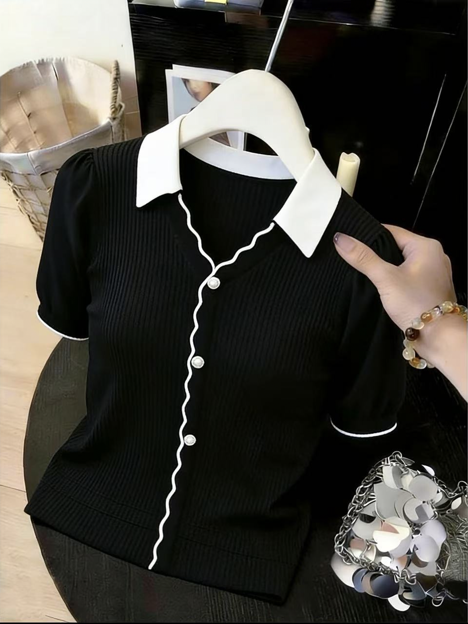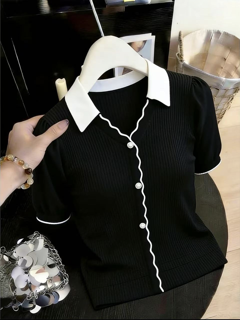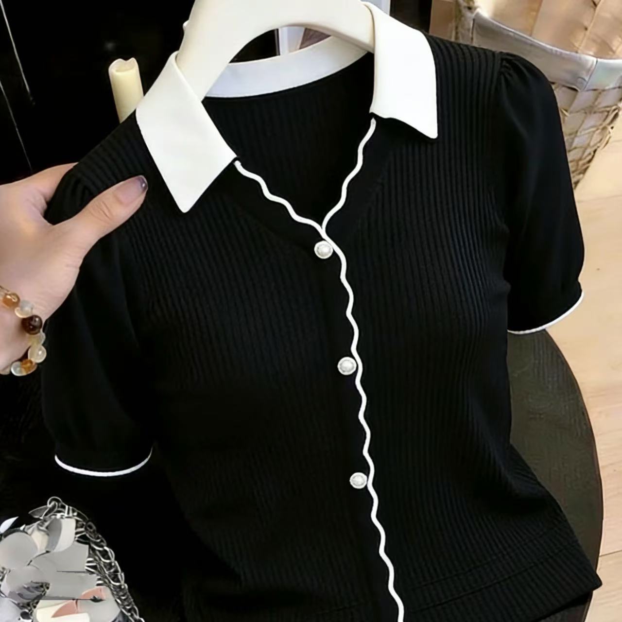 화이트 POLO 칼라 니트 반팔 여성 2026 새로운 여름 배색 구덩이 기사 슬림해 보이는 품격 다용도 쇼트 스타일 맨위