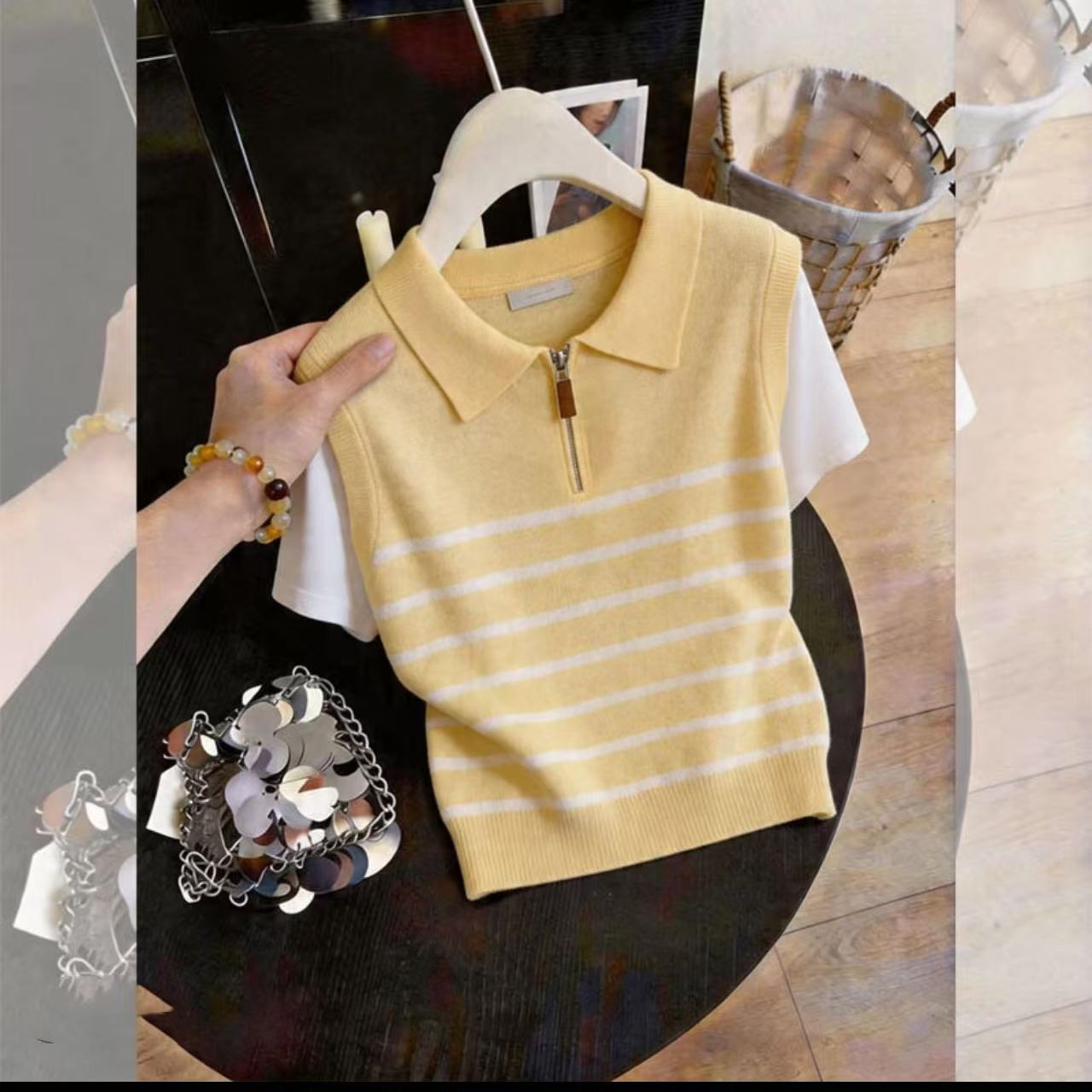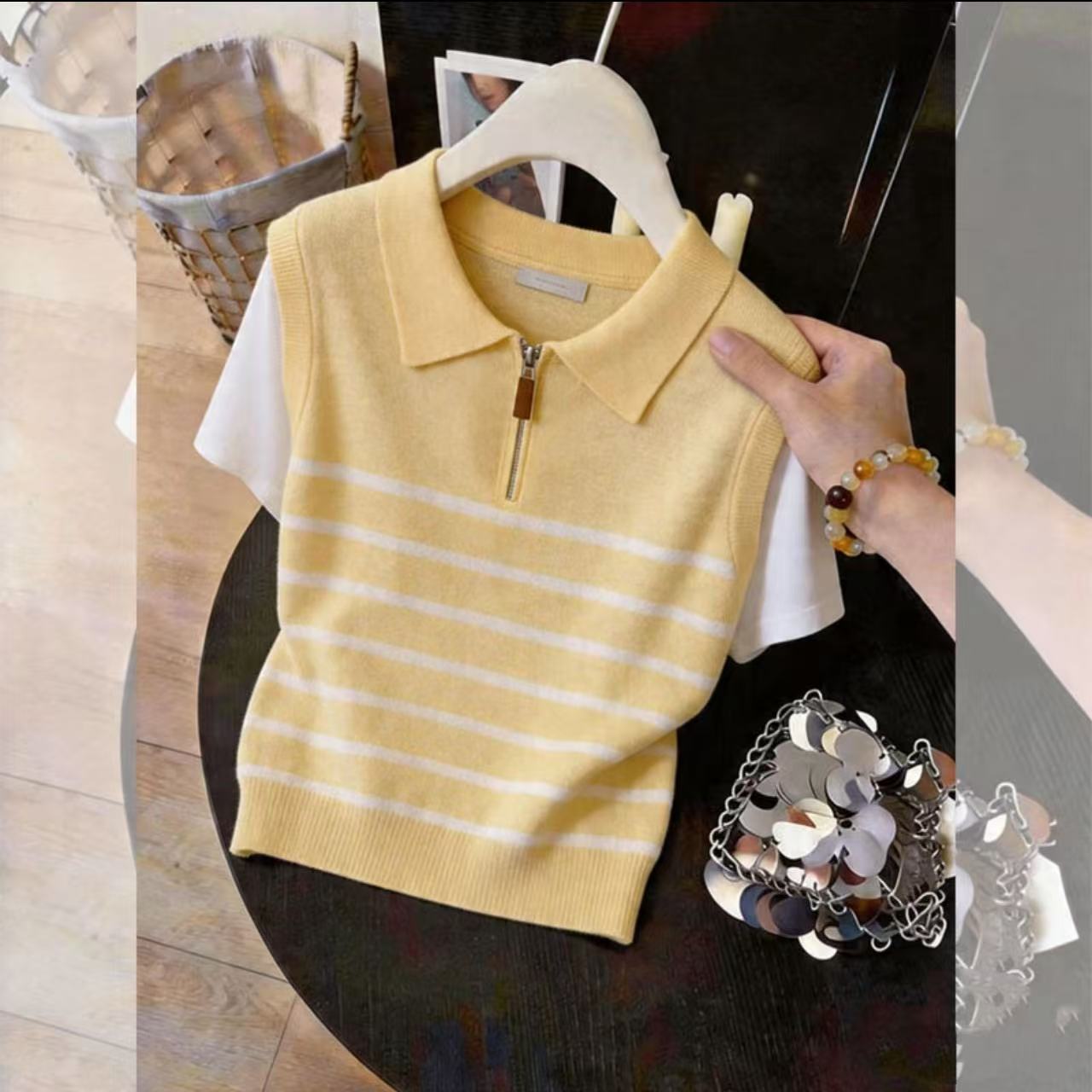 한 부서 학원 스타일 배색 폴로 칼라 니트 스웨터 맨위 2026 여름 새로운 캐주얼 스트라이프 반팔 맨위 여성