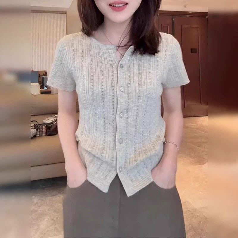디자인 센스 단색 반팔 니트 스웨터 여성 2026 년 여름 새로운 한국 스타일 싱글 줄 버튼 슬림해 보이는 패션 맨위