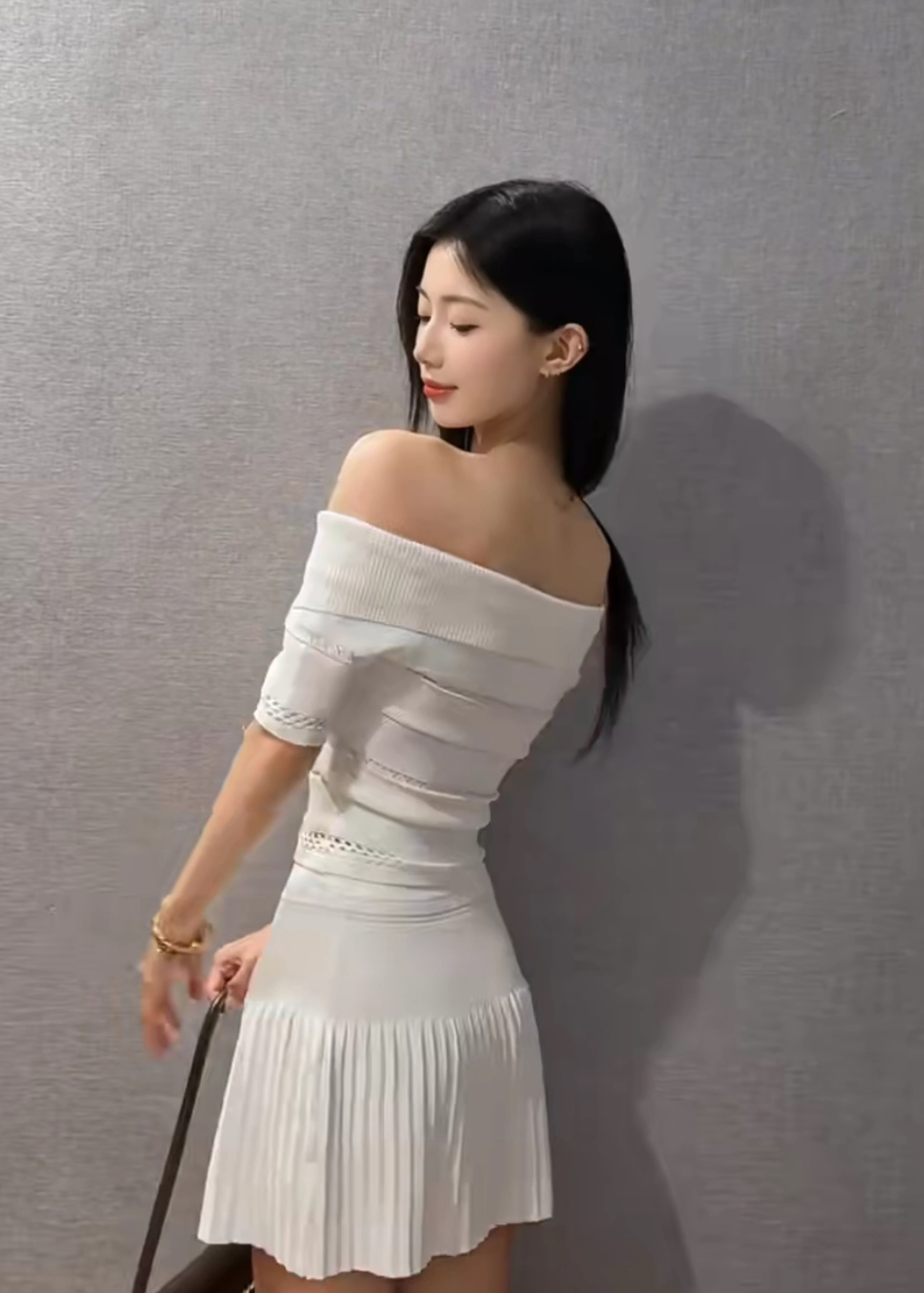오프숄더 니트 세트 여성 봄 여름 허리 수축 슬림해 보이는 쇼트 스타일 맨위 플리츠 반신 스커트 투피스 세트