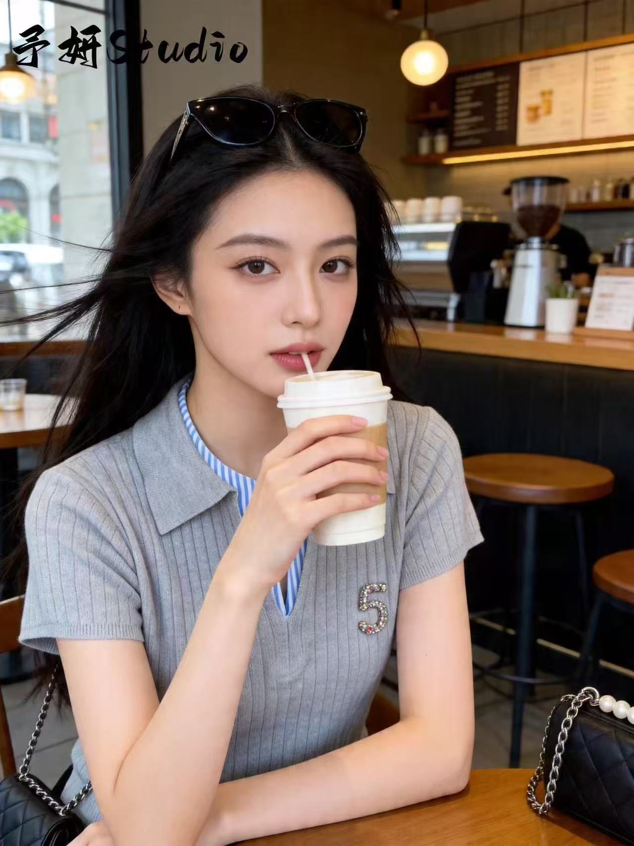 오래된 돈 바람 카키 색 폴로 칼라 니트 반팔 티셔츠 여성 여름 몸매 가꾸기 품격 고유 한 아름다운 그레이트 봐. 의류