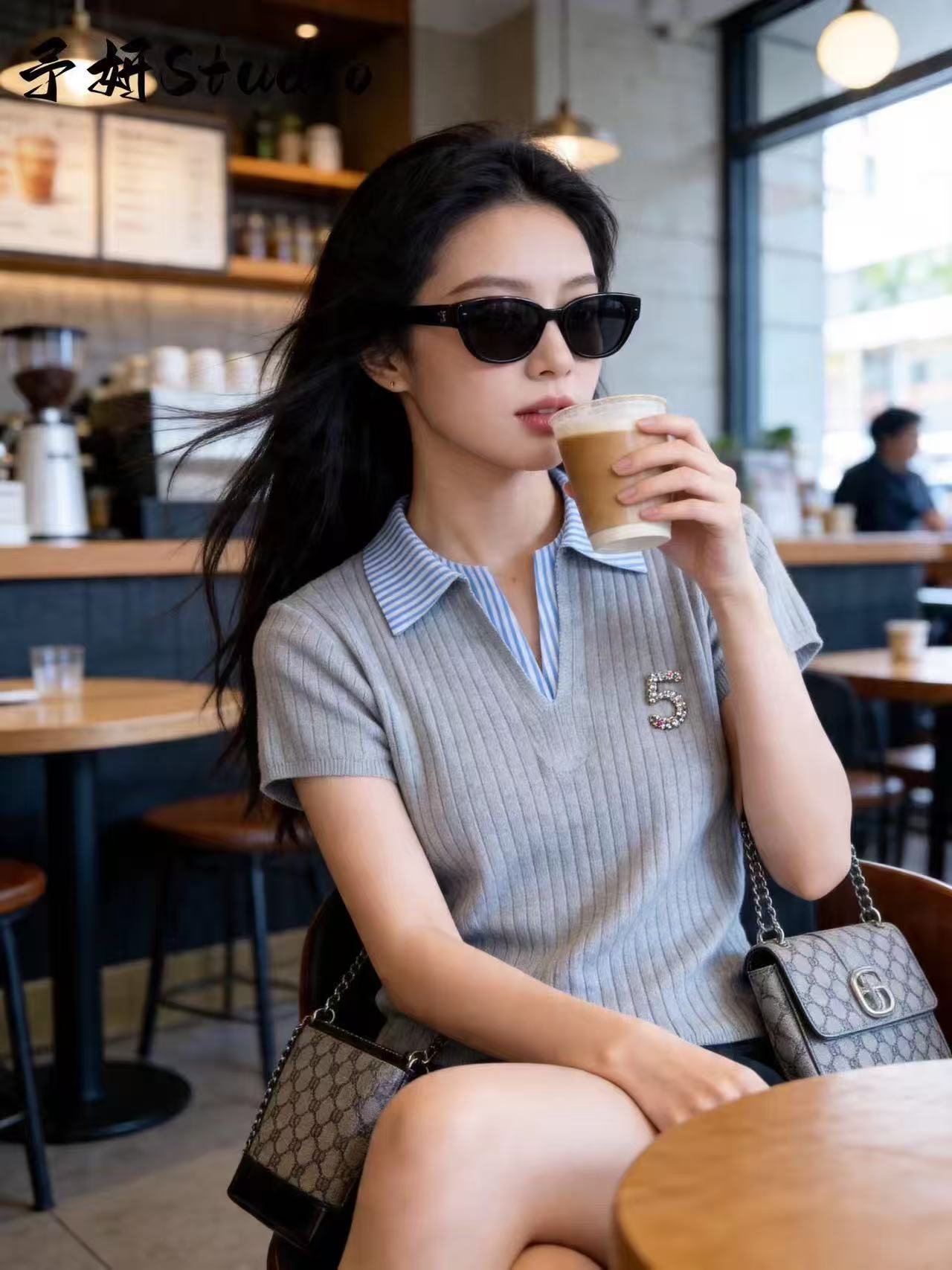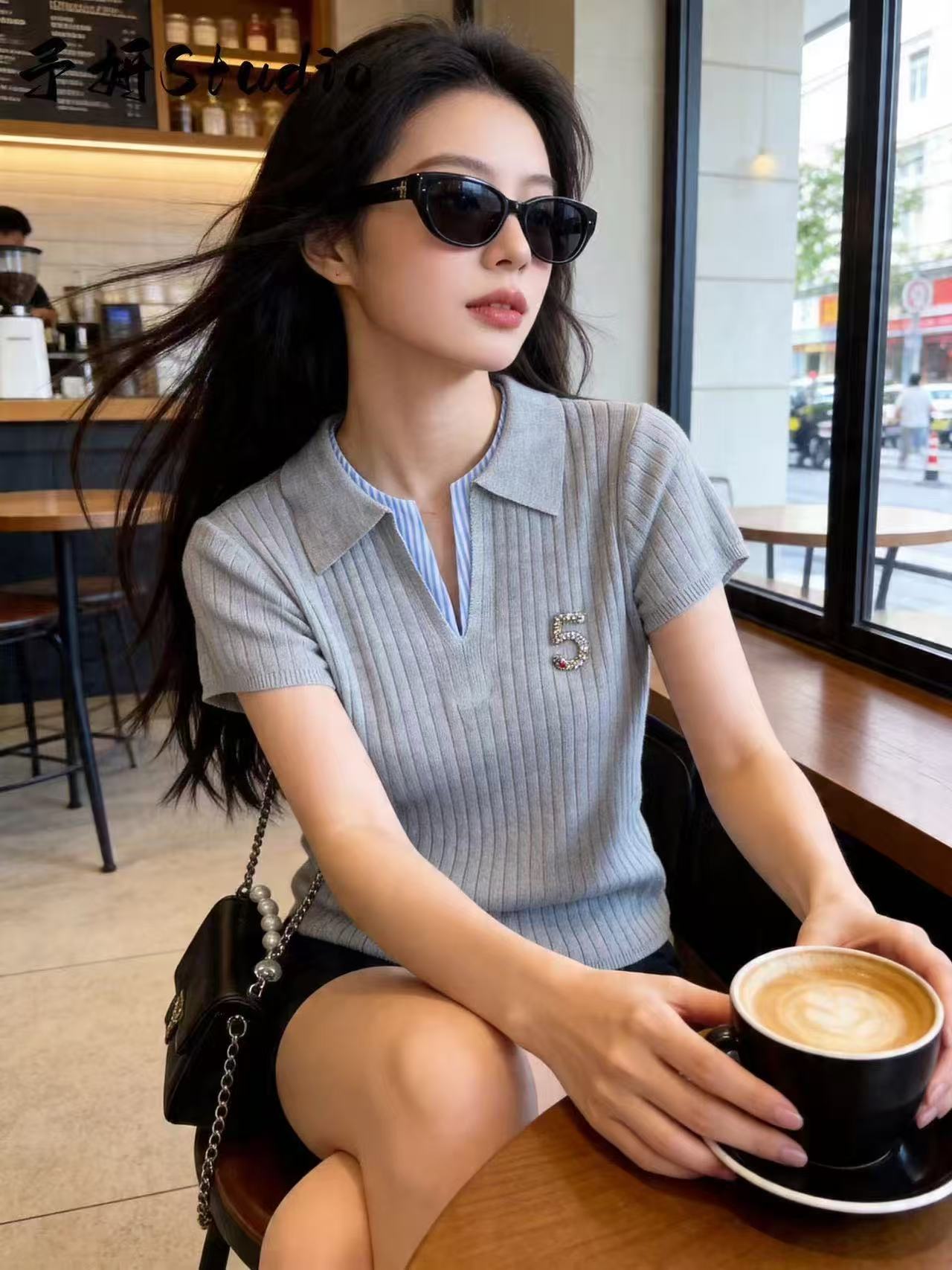 2026 여름 새로운 학원 스타일 폴로 칼라 반팔 니트 스웨터 여성 페이크 레이어드 다용도 연령 감소 맨위 회색 티셔츠