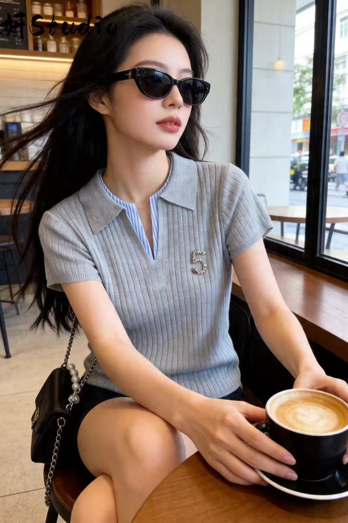 POLO 칼라 스트라이프 아름다운 맨위 여성 의류 외국 가스 패션 디자인 센스 연령 감소 니트 반팔 티셔츠 여름 새로운