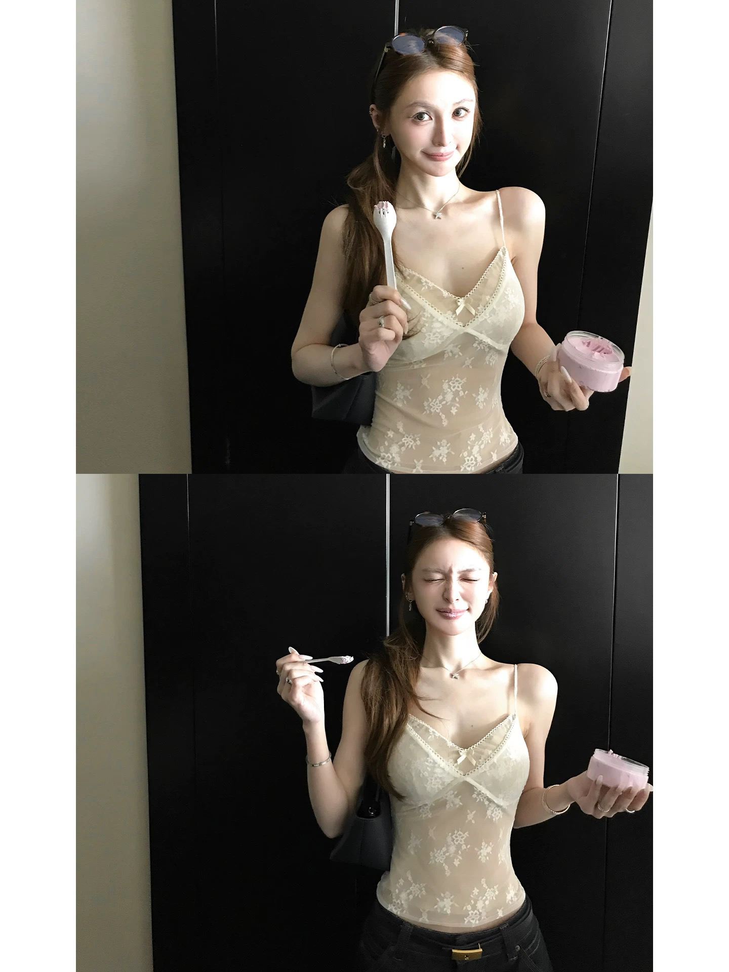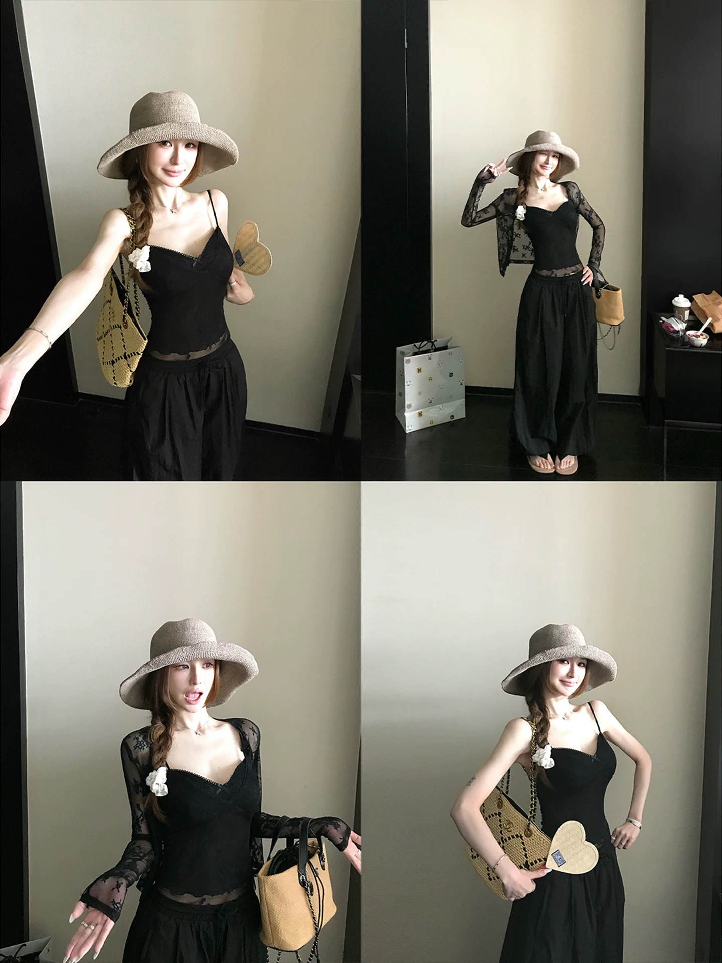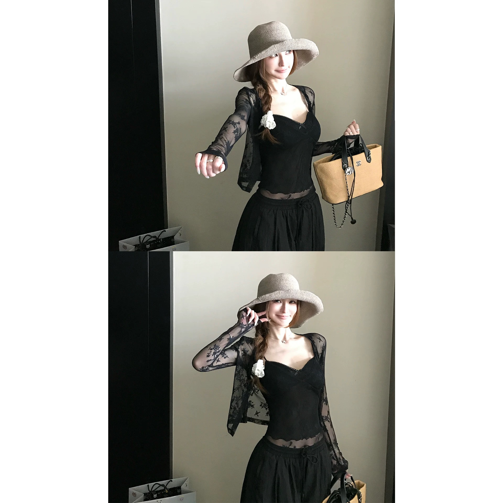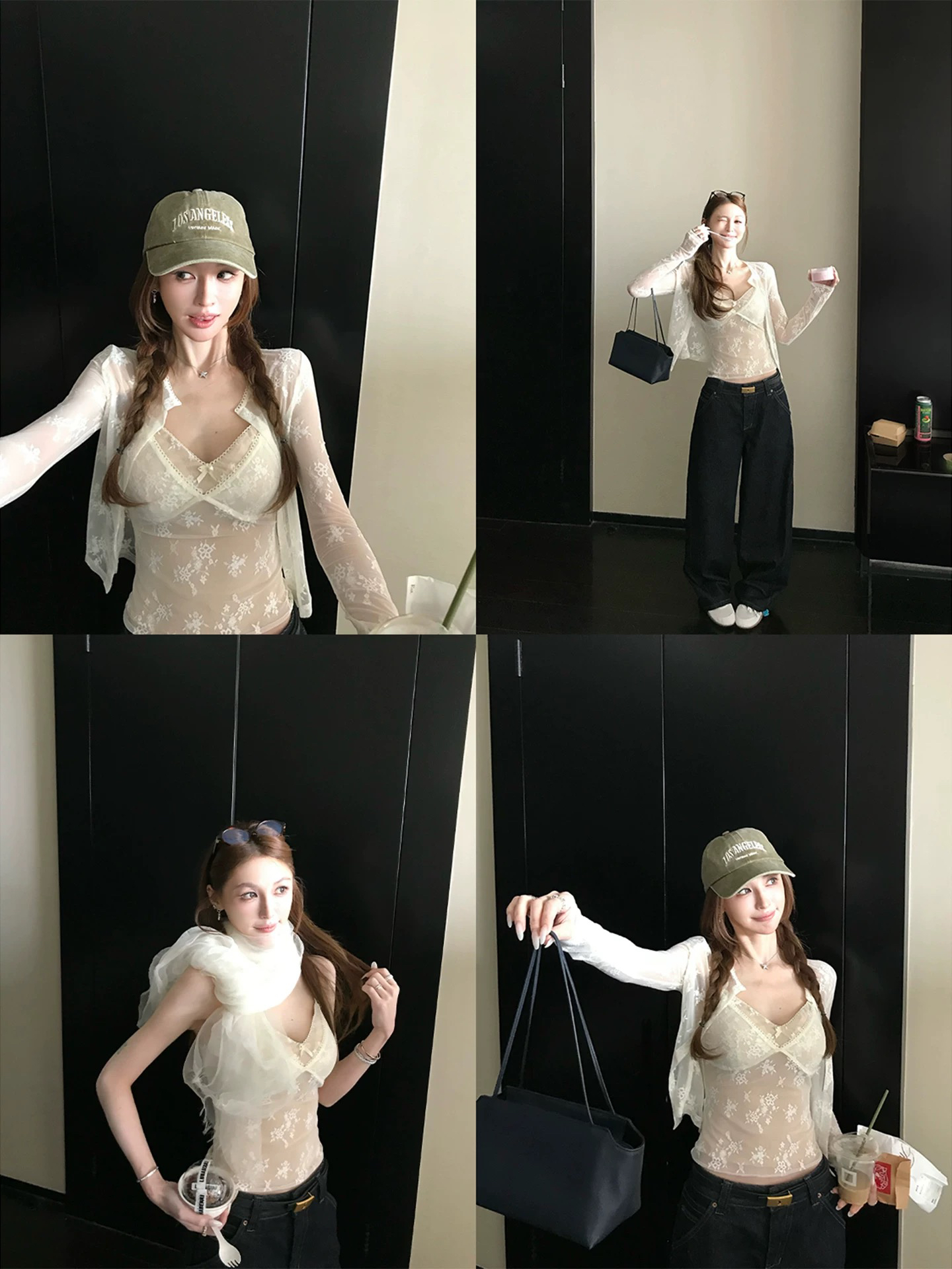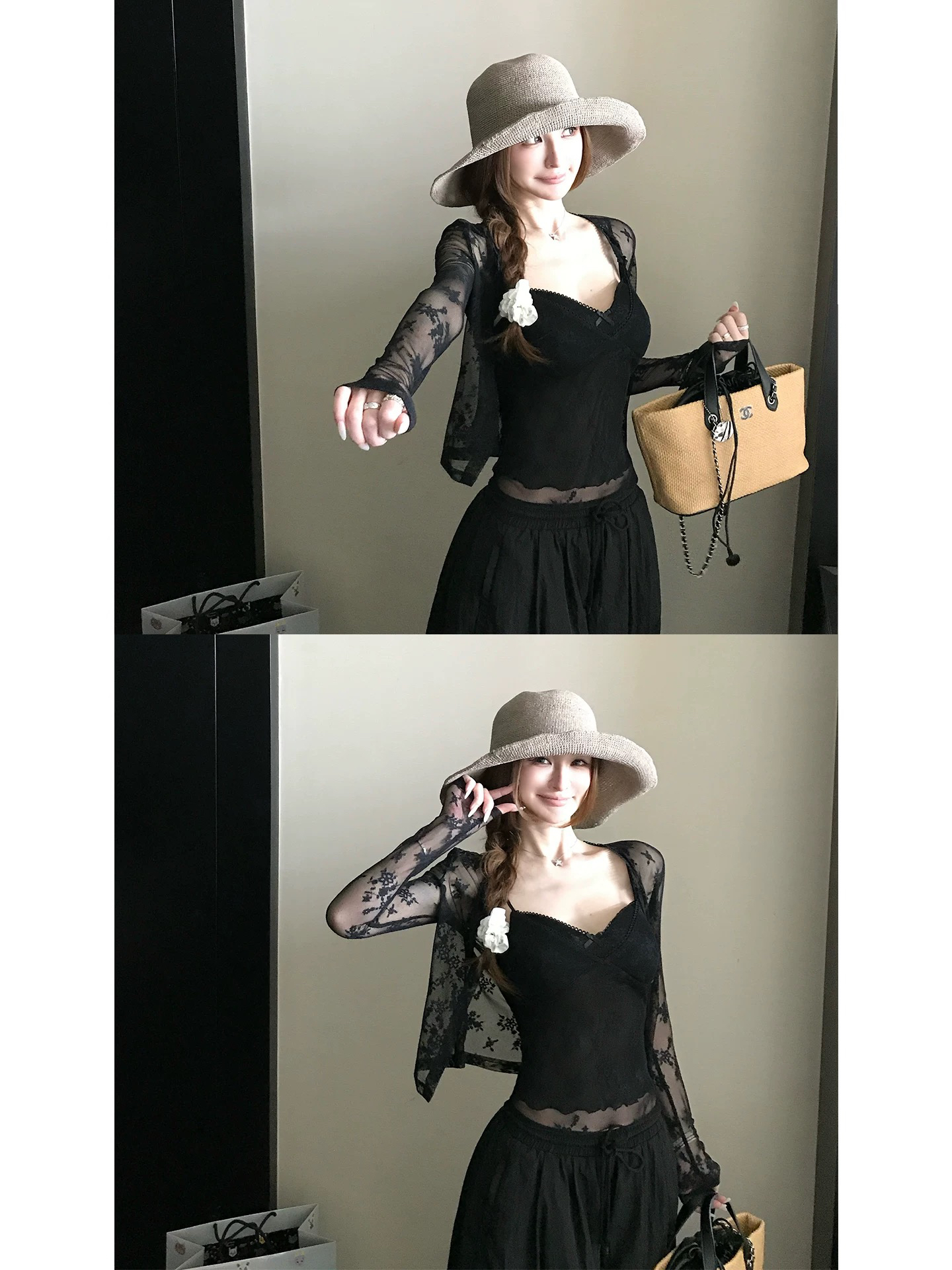 skk store 소녀 마음 민소매 작은 셔츠 순수한 욕망 망사 자카드 레이스 캐미솔 오픈 가디건