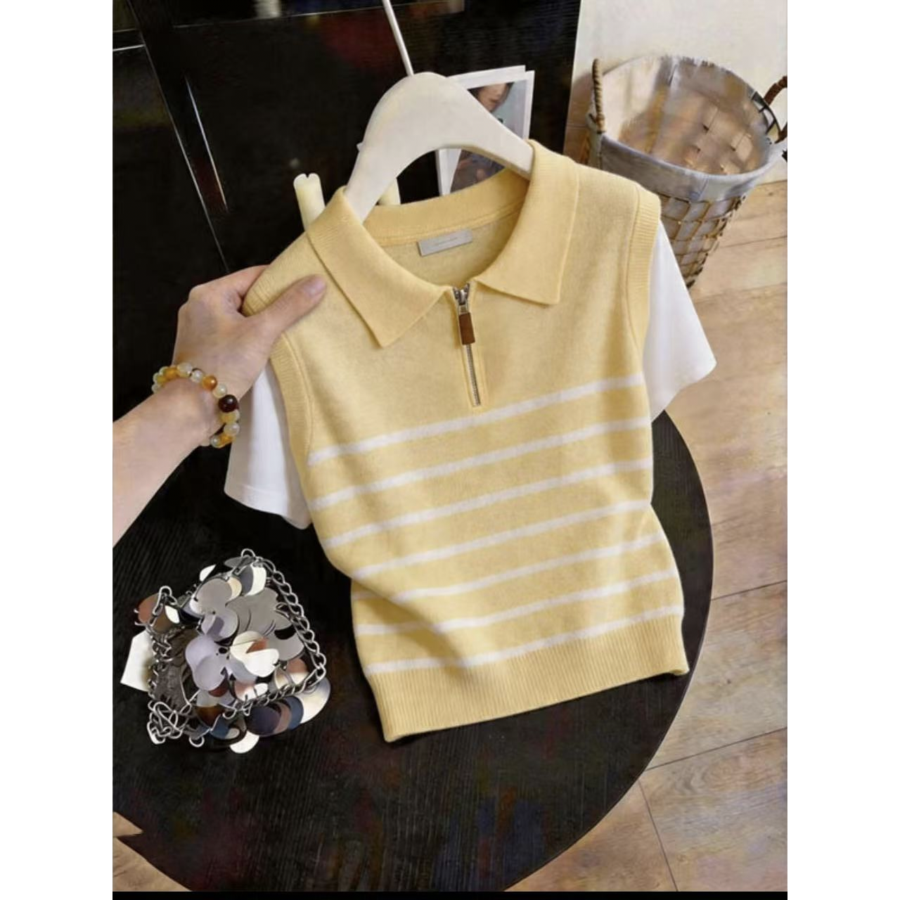 한 부서 배색 페이크 레이어드 니트 스웨터 여성 여름 섹션 학원 스타일 하프 지퍼 반팔 POLO 셔츠 디자인 센스 맨위