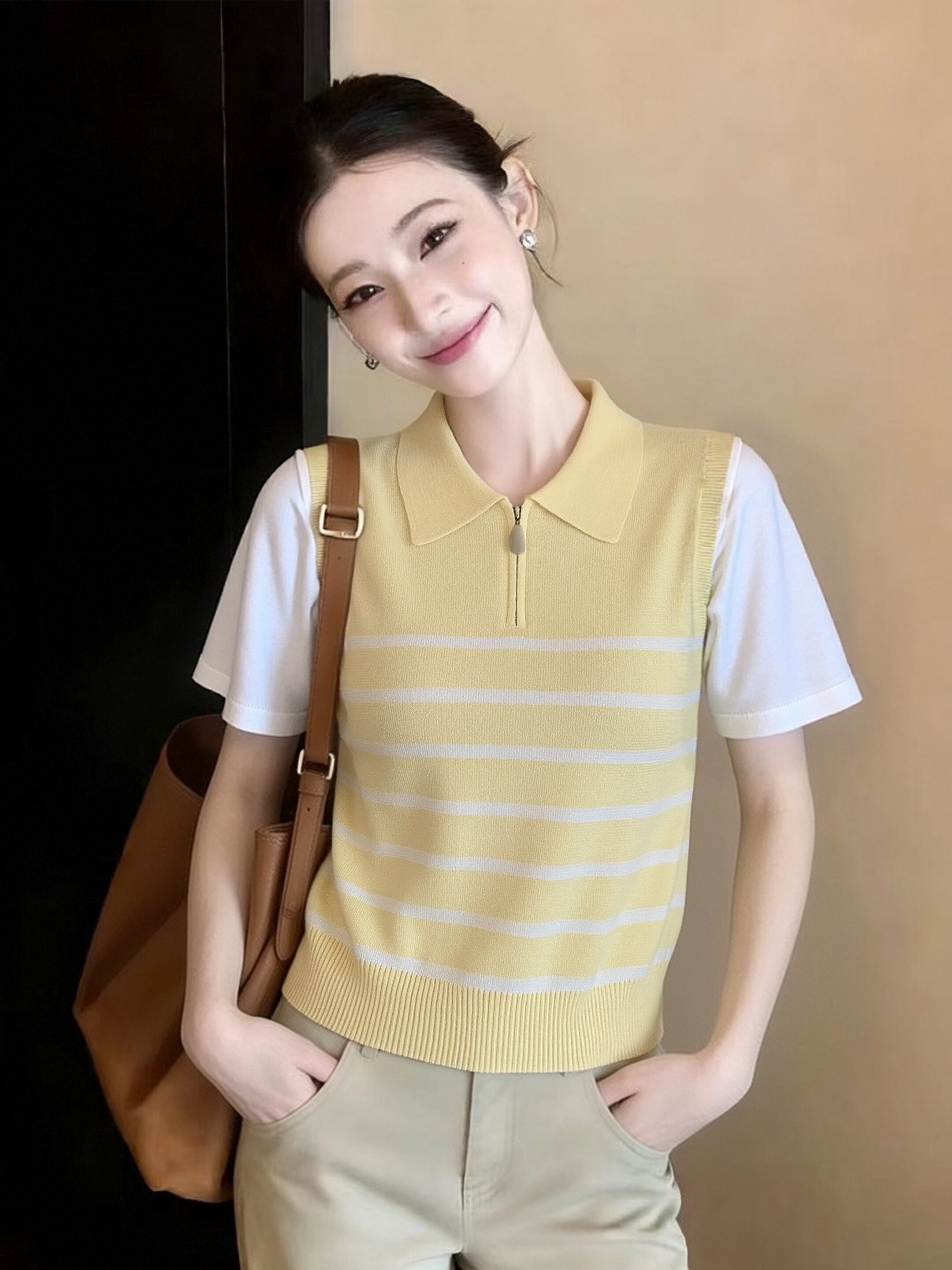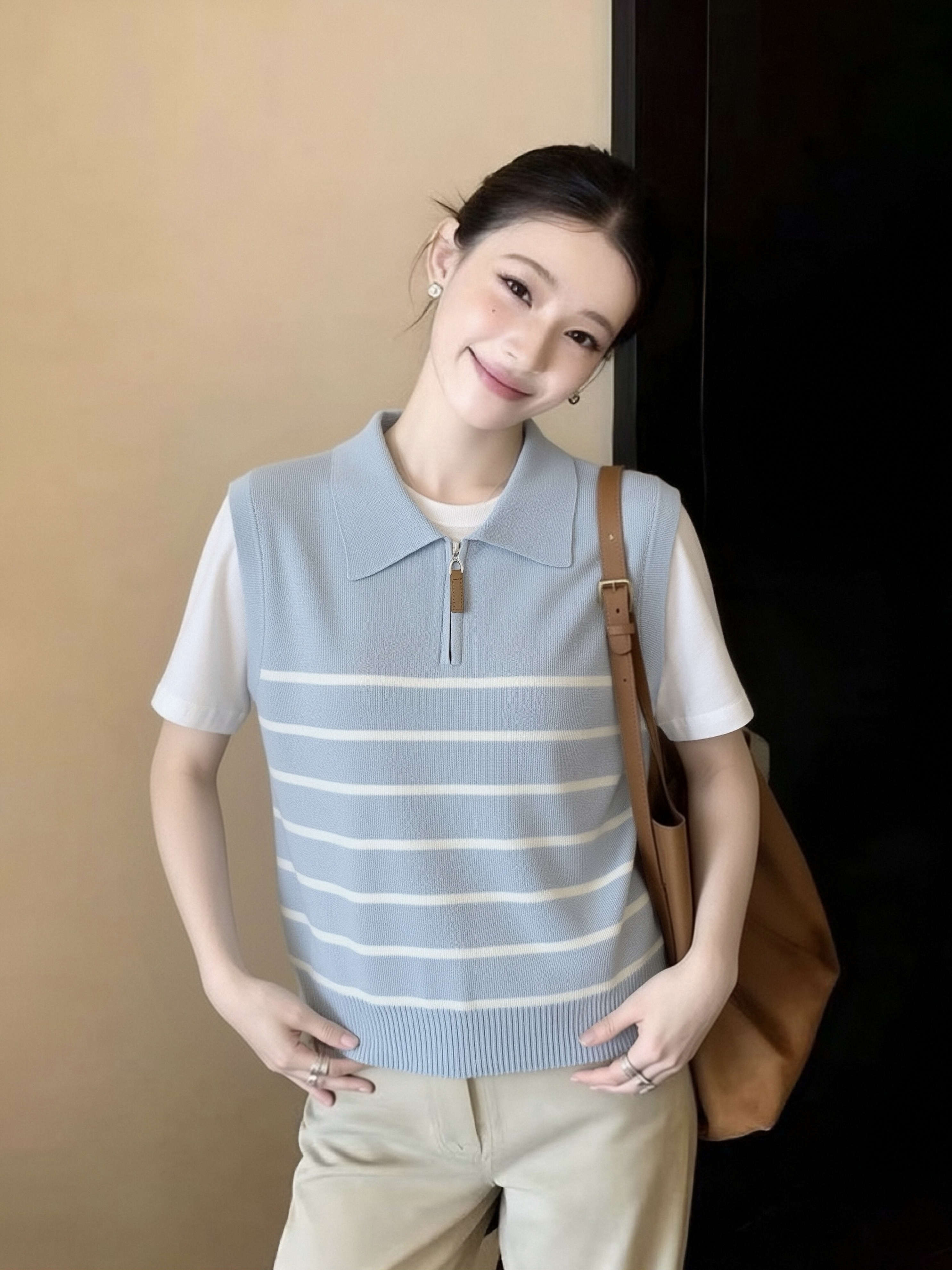 2026 봄 여름 아메리칸 레트로 V넥 니트 스웨터 여성 배색 폴로 칼라 스트라이프 디자인 센스 품격 프로 피부 맨위