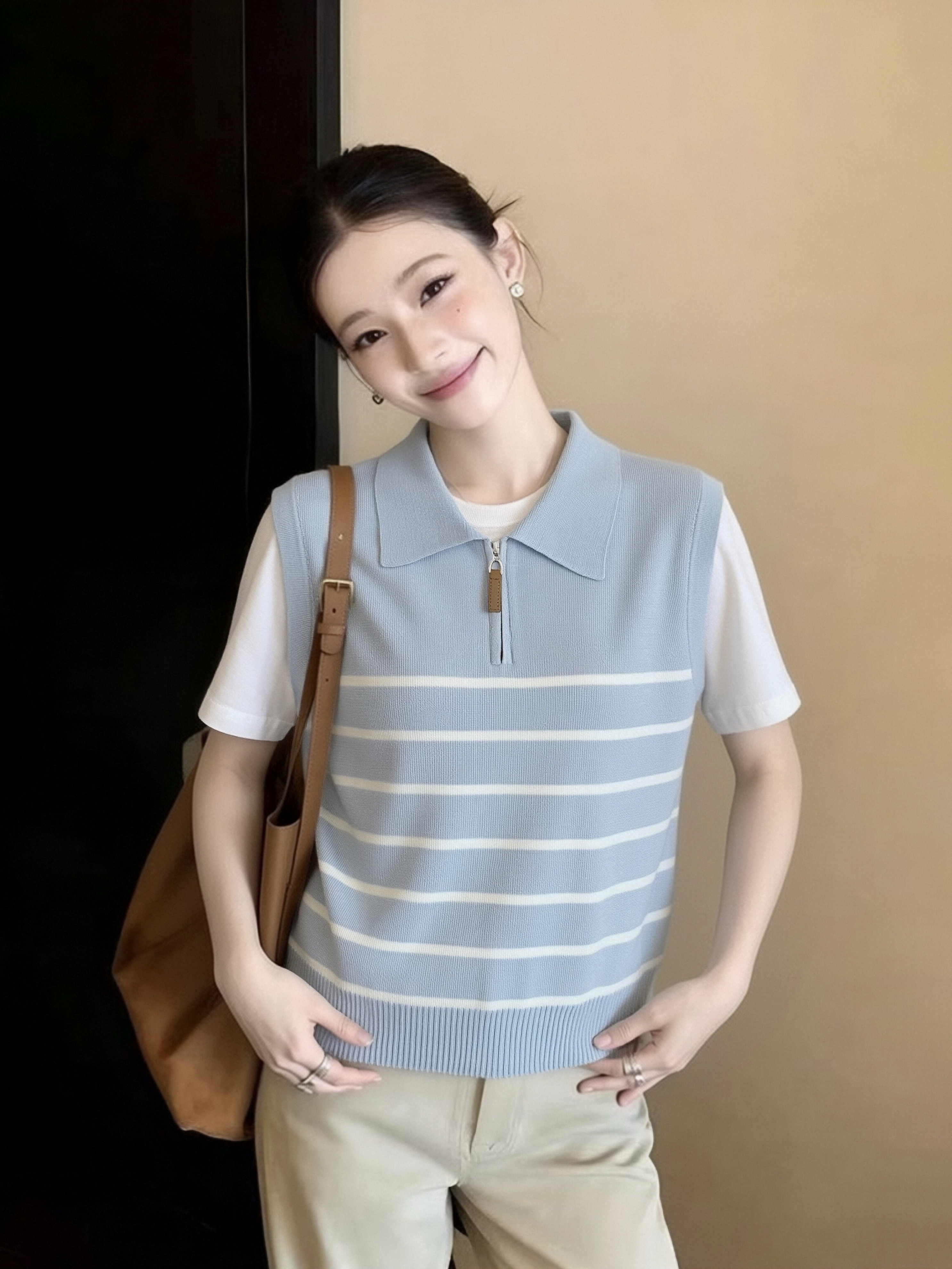 2025 년 여름 새로운 미니멀리즘 스트라이프 싱글 줄 버튼 디자인 민소매 니트 맨위 품격 다용도 여성