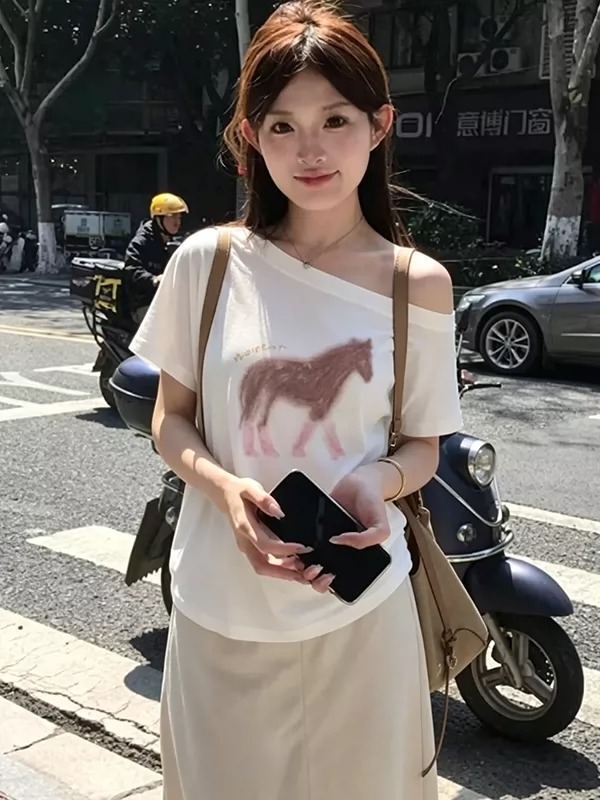 경관 그림 40 순면 220 그램 92 면 8 암모니아 Lun 비스듬한 칼라 오프숄더 오프숄더 반팔 티셔츠 여성 프린트