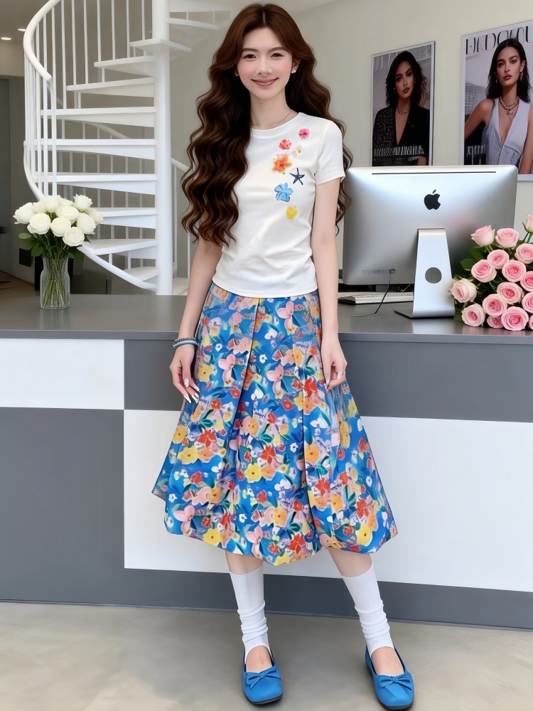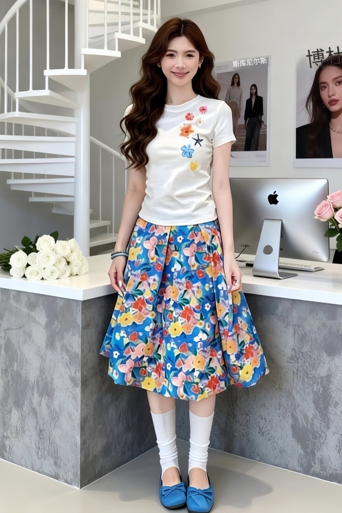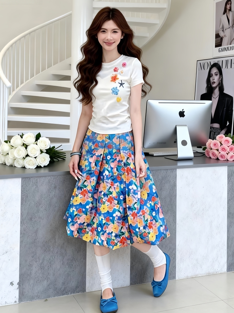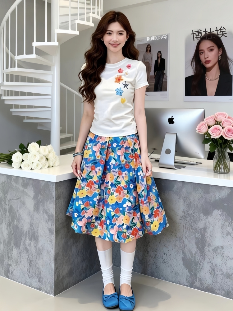 연령 감소 코디 전체 집합 여름 작은 대중 디자인 센스 자이언트 잘 생긴 반팔 맨위 꽃무늬 반신 스커트 투피스 슈트