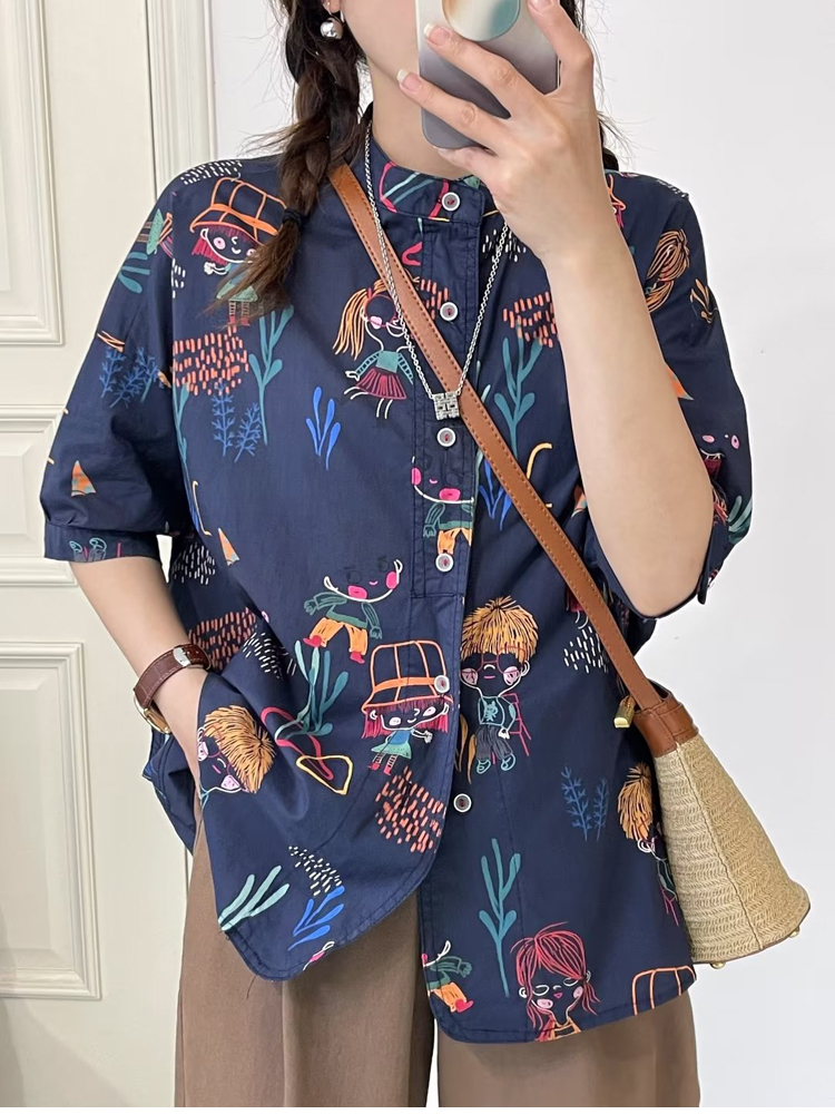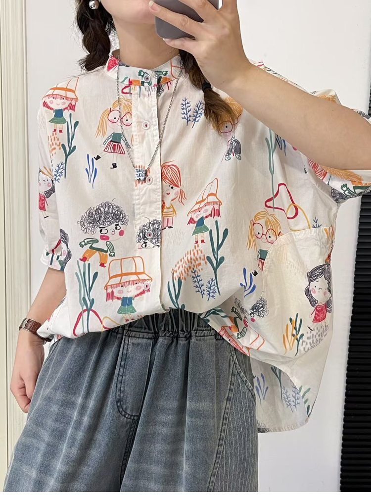 여름 새로운 주간 싱글 반팔 프린트 여성 셔츠 달콤함 스탠드 칼라 빅 사이즈 슬림해 보이는 순면 얇은 스타일 셔츠