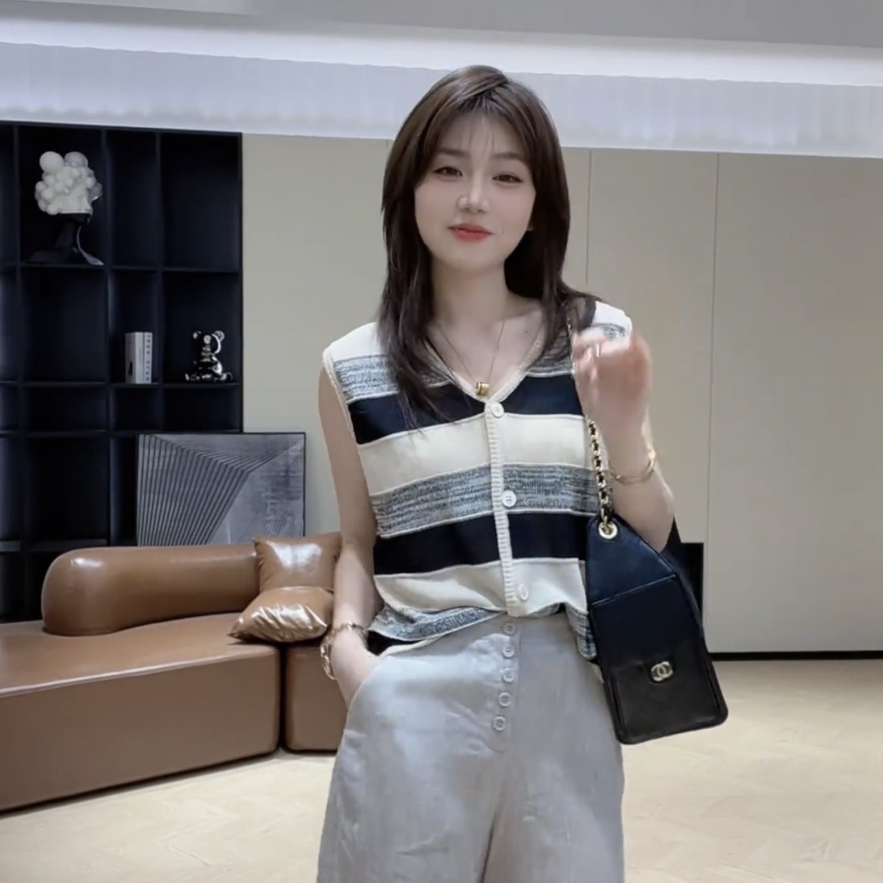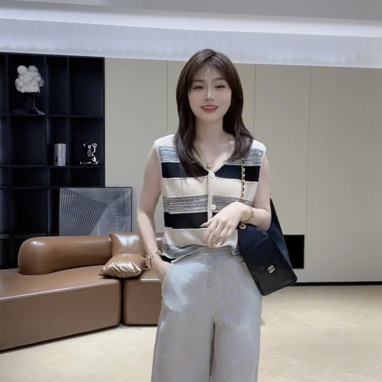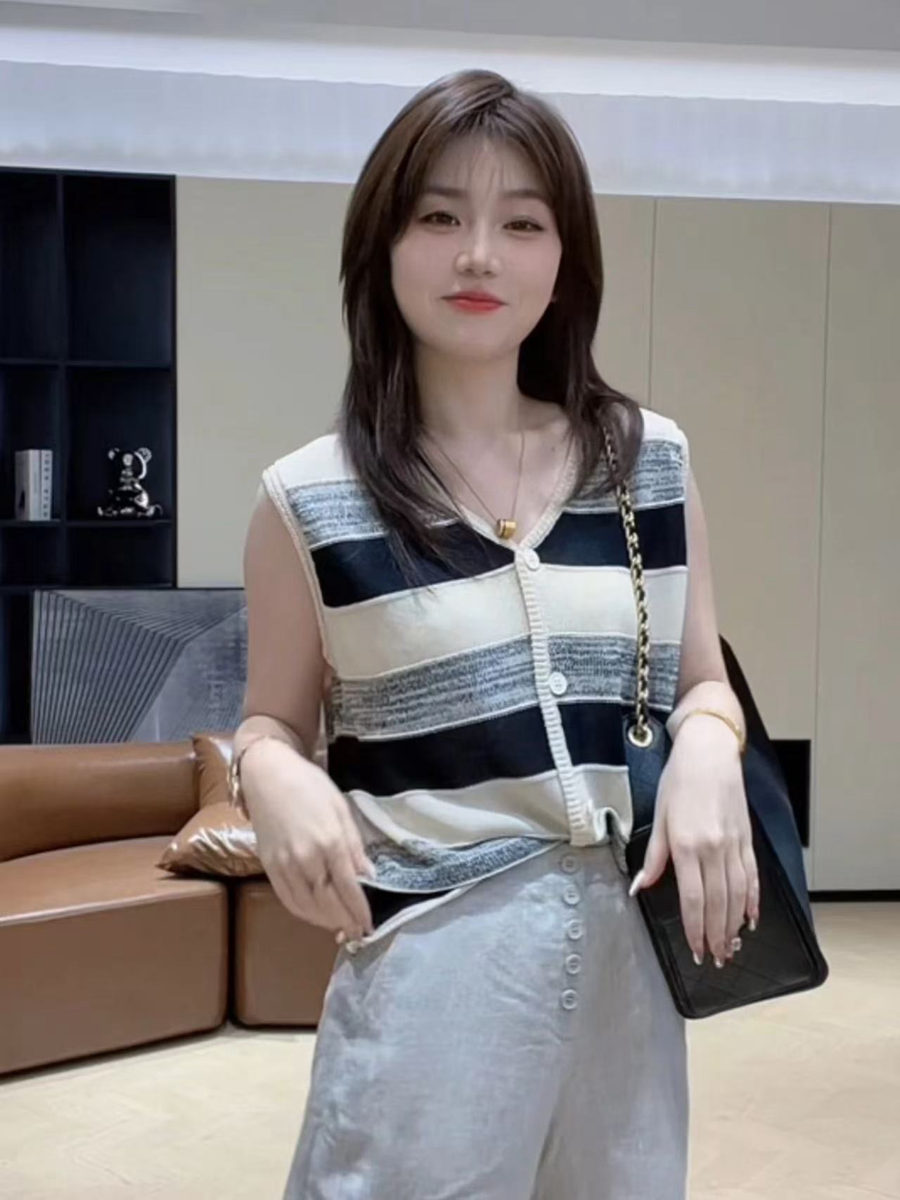 2025 년 여름 새로운 미니멀리즘 스트라이프 싱글 줄 버튼 디자인 민소매 니트 맨위 품격 다용도 여성