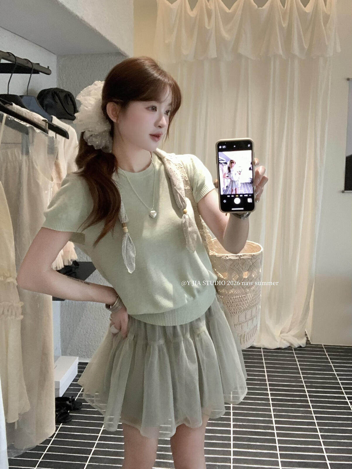 장 베이 베이 ibell 라이 경기 서울 주간 실크 양모 레트로 느슨함 센스 얇고 가벼운 통기성 스택 착용 배색 투피스 세트