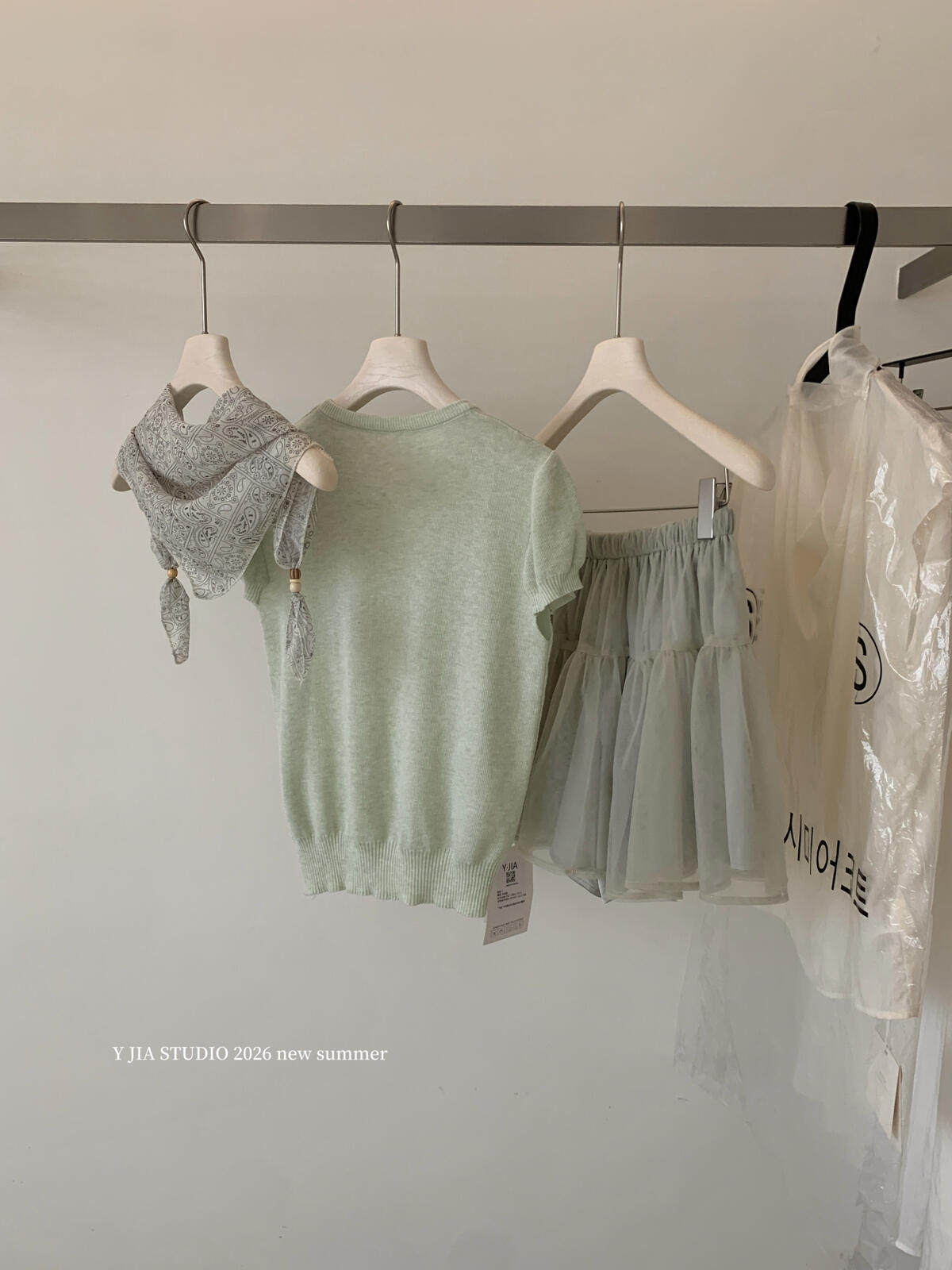 봄 여름 섹션 부드러운 니트 맨위 한 마디 반신 스커트 세트 조립 스카프