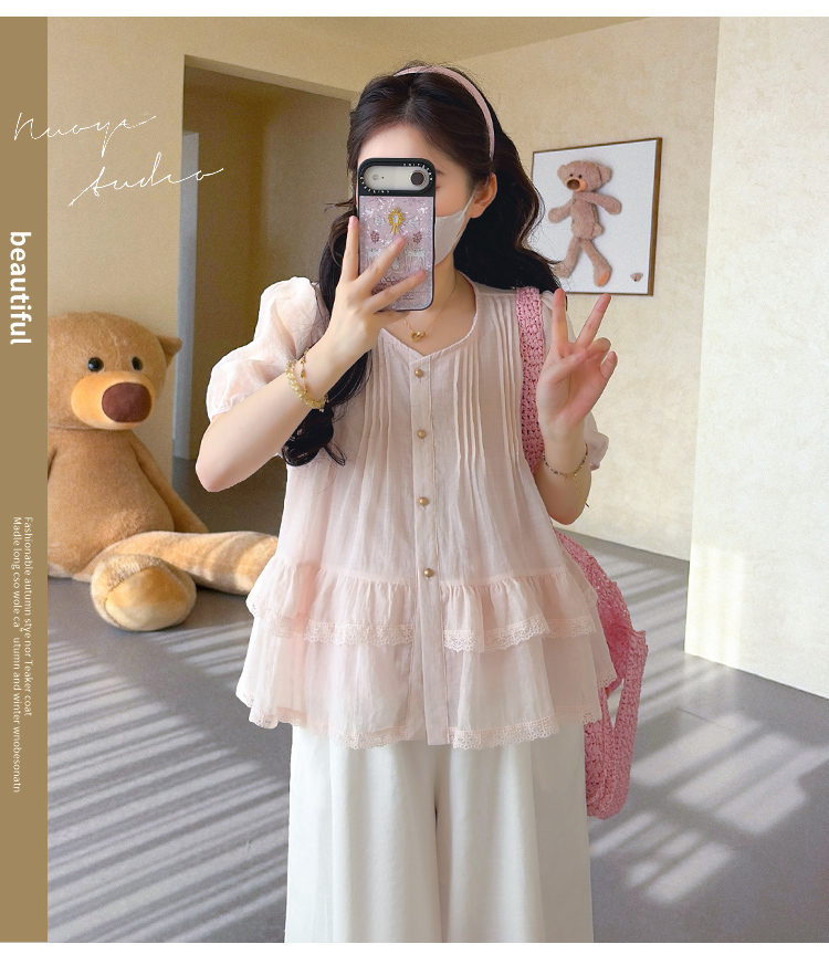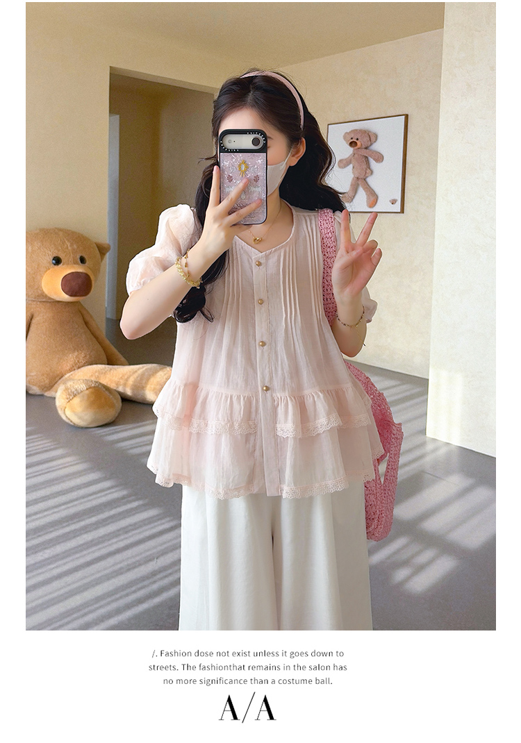 실사 신제품 2026 여름 새로운 프랑스식 레이스 조각 셔츠 루즈핏 맨위 와이드 레그 팬츠 세트