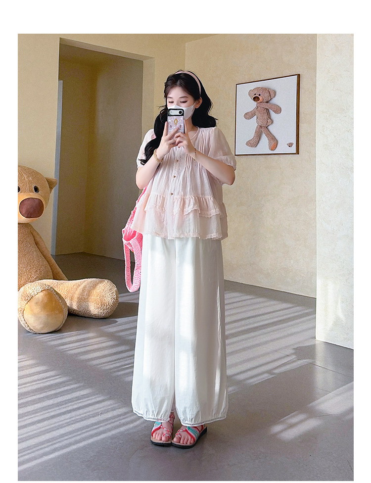 실사 지금 2026 여름 신제품 클래식 체크무늬 맨위 면 린넨 통기성 와이드 레그 팬츠 임산부 세트