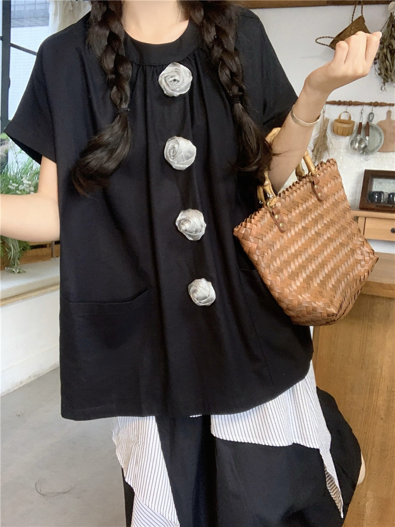 실사 일본식 귀여운 3 차원 장미 라운드 넥 반팔 불규칙 반신 스커트