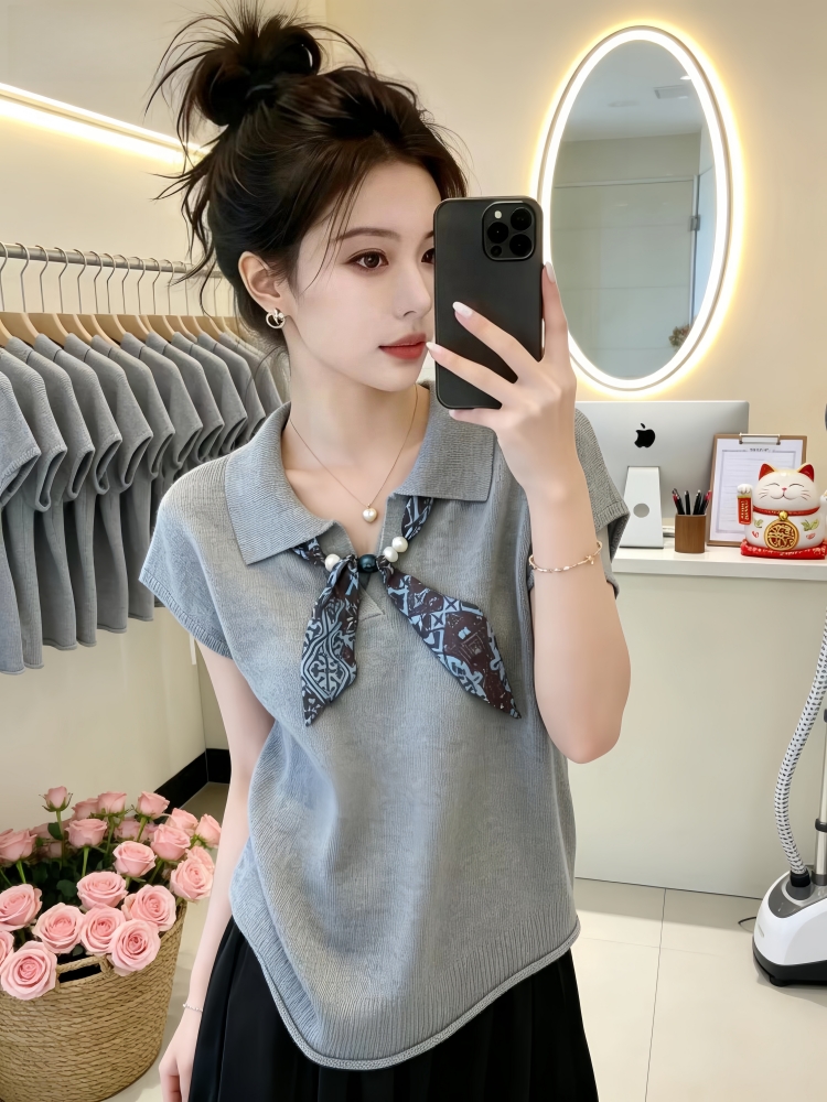 출퇴근 품격 회색 POLO 칼라 스카프 몸매 가꾸기 맨위 여성 2026 새로운 여름 자이언트 잘 생긴 반팔 니트 스웨터