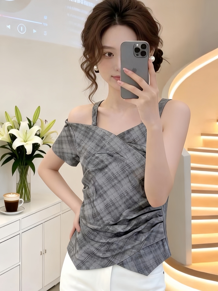 섹시함 V넥 티셔츠 여성 2026 새로운 여름 디자인 센스 불규칙 맨위 몸매 가꾸기 슬림해 보이는 외국 가스 반팔 작은 셔츠