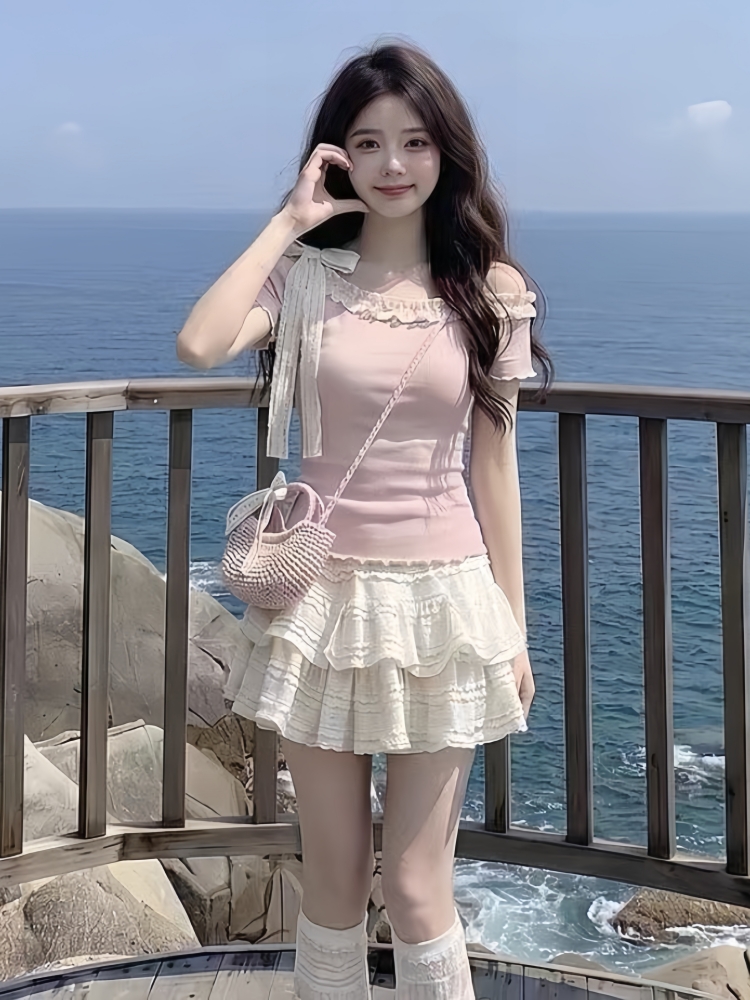 한 부서 부드러운 핑크색 몸매 가꾸기 비스듬한 어깨 나비 매듭 반팔 티셔츠 여성 2026 새로운 여름 고유 한 아름다운 맨위