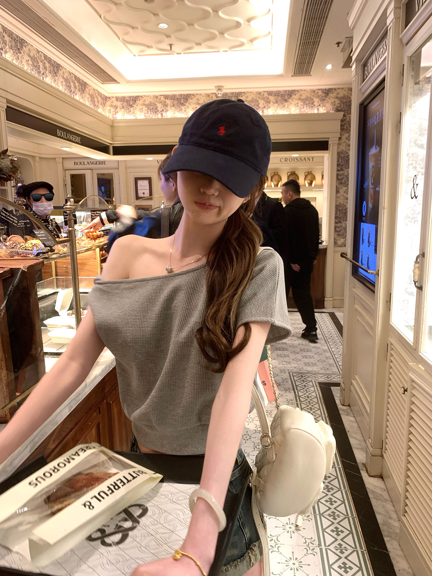 디스크 디스크 한 여성 돌아 가기 비틀림 오프숄더 후아 남편 그리드 반팔 티셔츠 여성 여름 디자인 센스 쇼트 스타일 비스듬한 어깨 의류