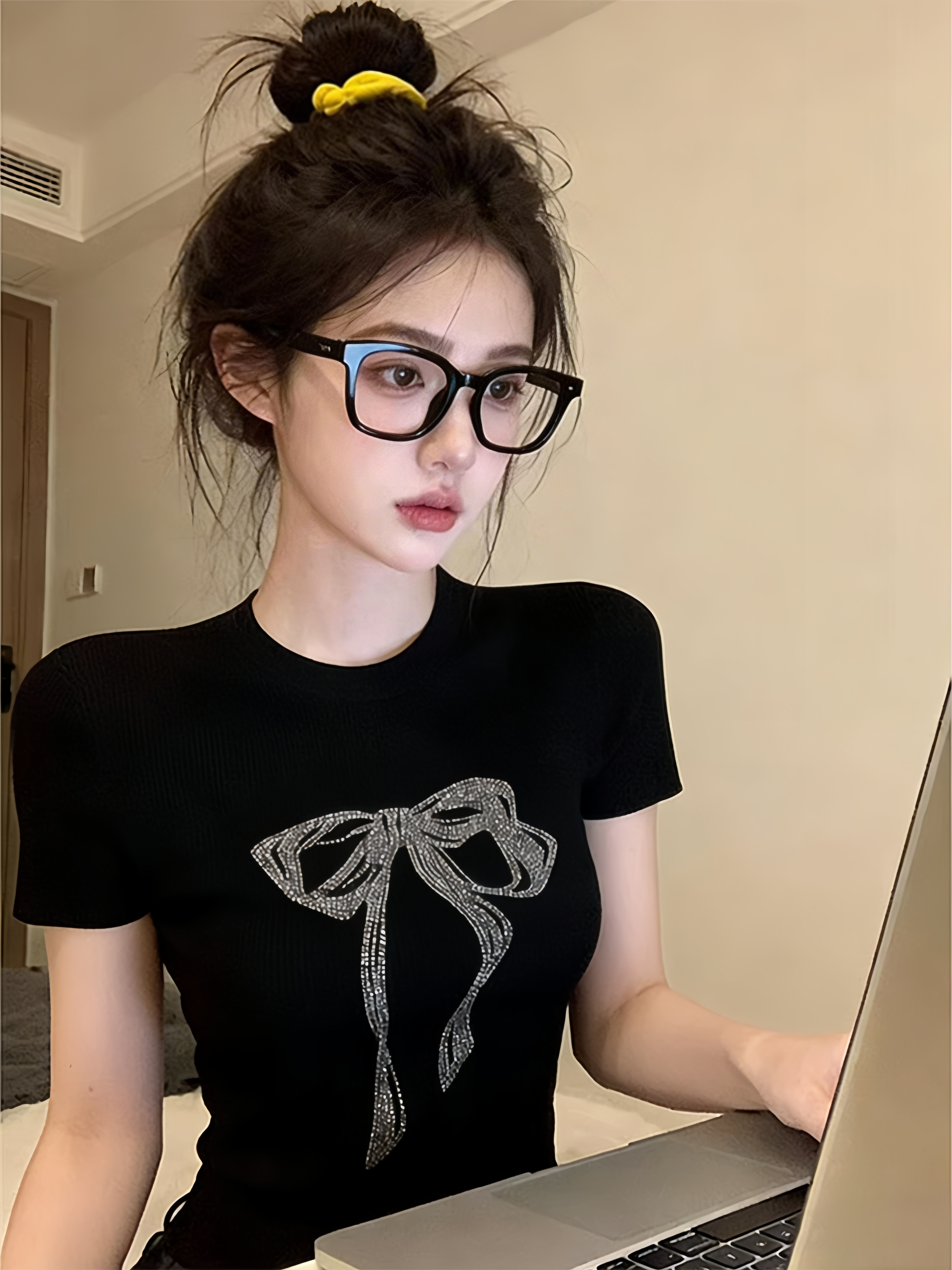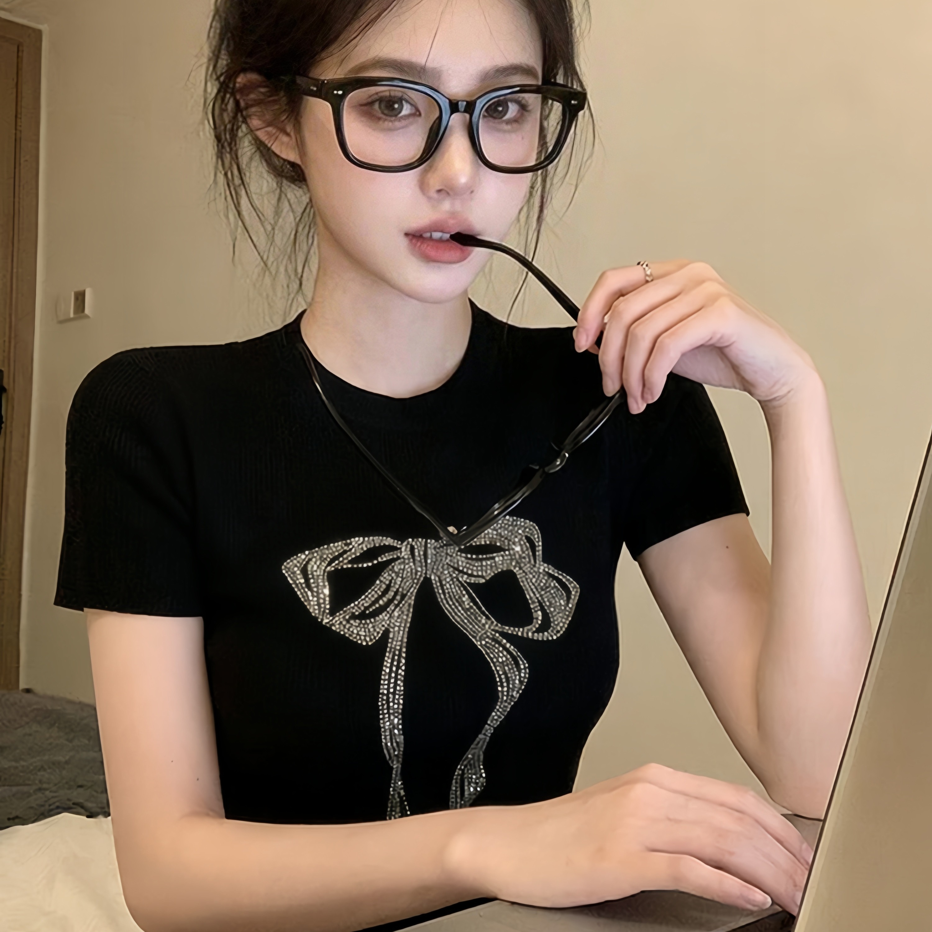 검정색 나비 매듭 긍정적 인 어깨 라운드 넥 반팔 티셔츠 여름 올해 인기 ~ 중 달콤한 매운맛 바람 몸매 가꾸기 쇼트 스타일 작은 맨위