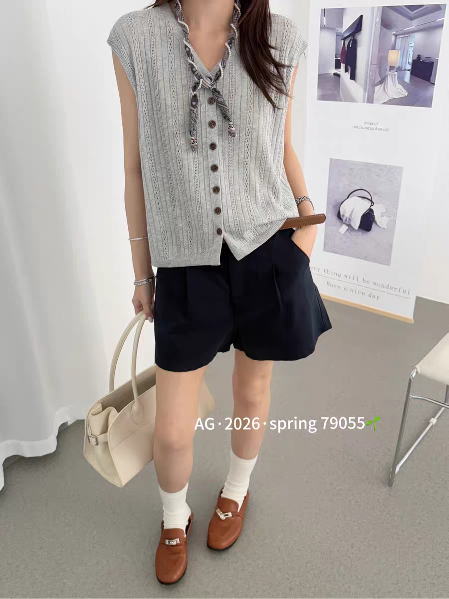 2025 년 여름 새로운 미니멀리즘 스트라이프 싱글 줄 버튼 디자인 민소매 니트 맨위 품격 다용도 여성