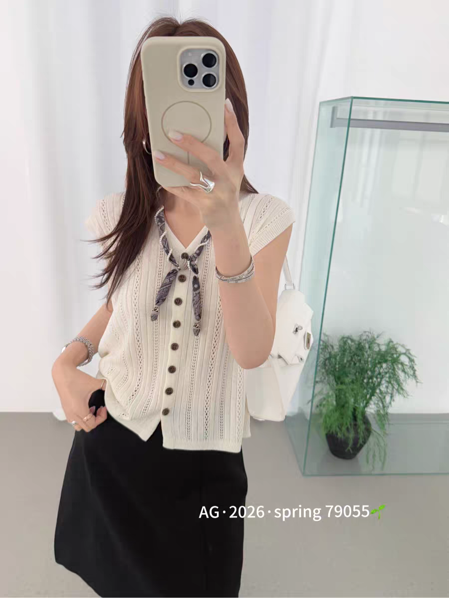 스카프 레이스업 V넥 얼음 실크 반팔 티셔츠 여성 의류 2026 년 여름 새로운 품격 슬림해 보이는 다용도 니트 맨위
