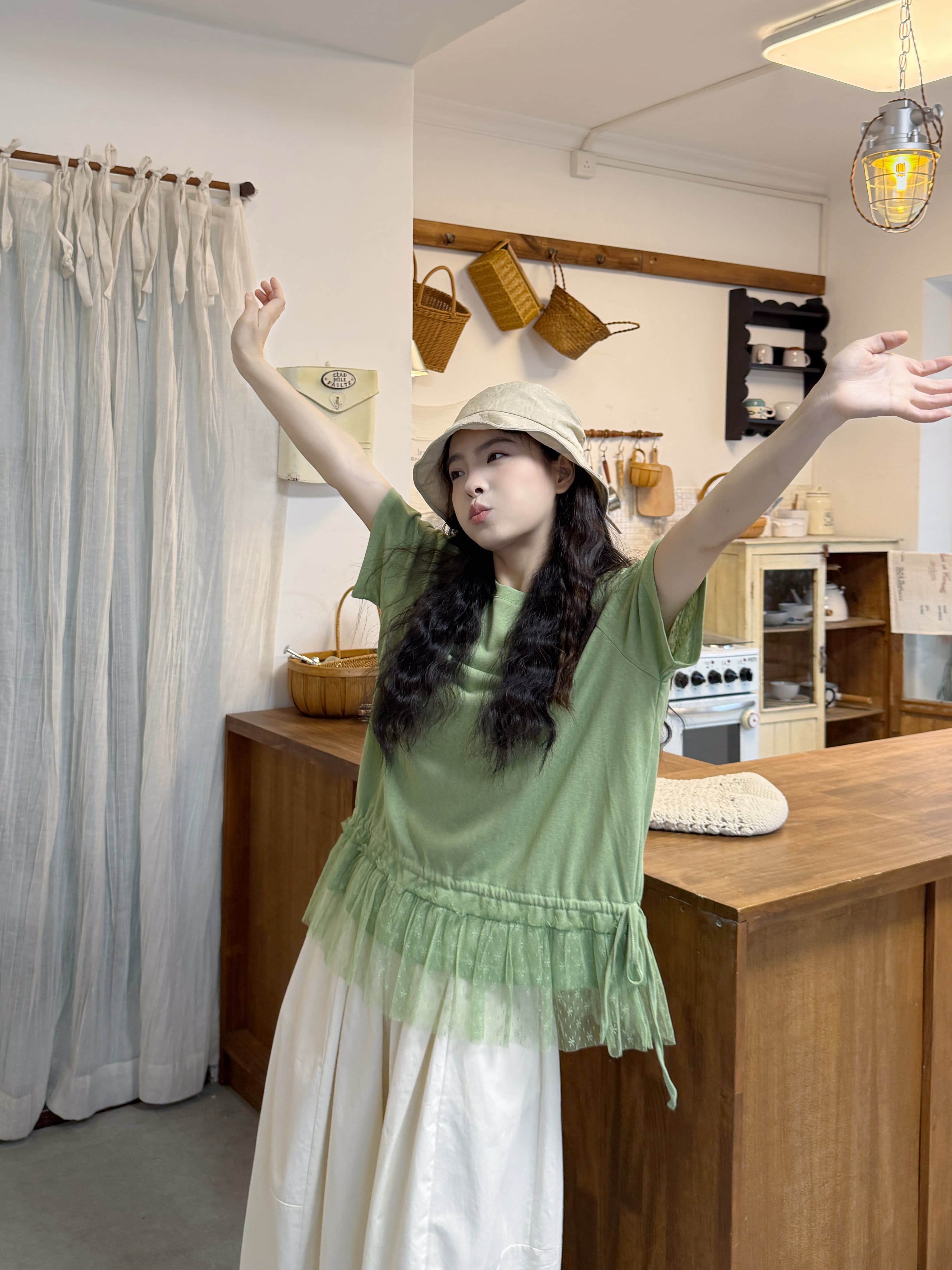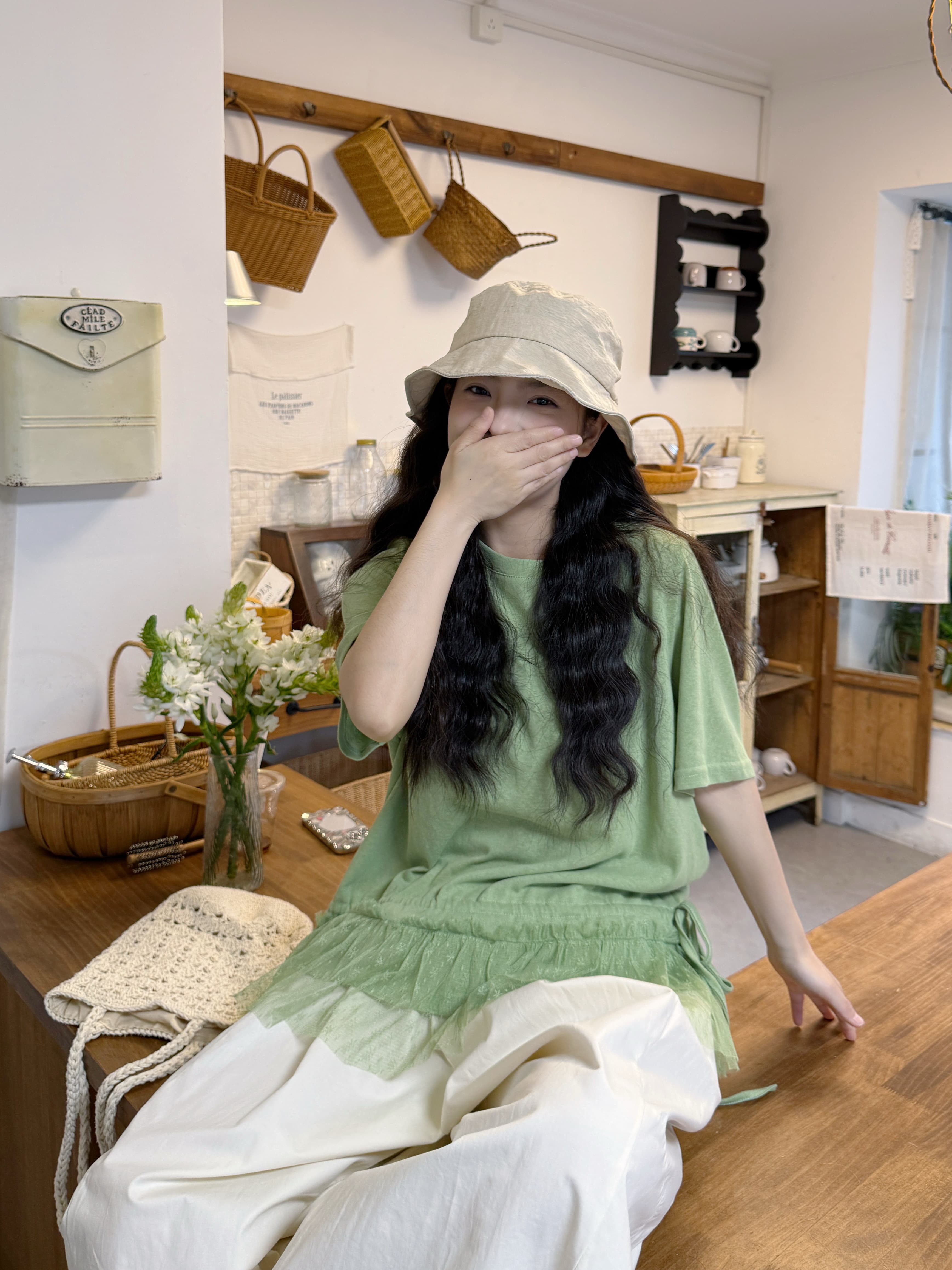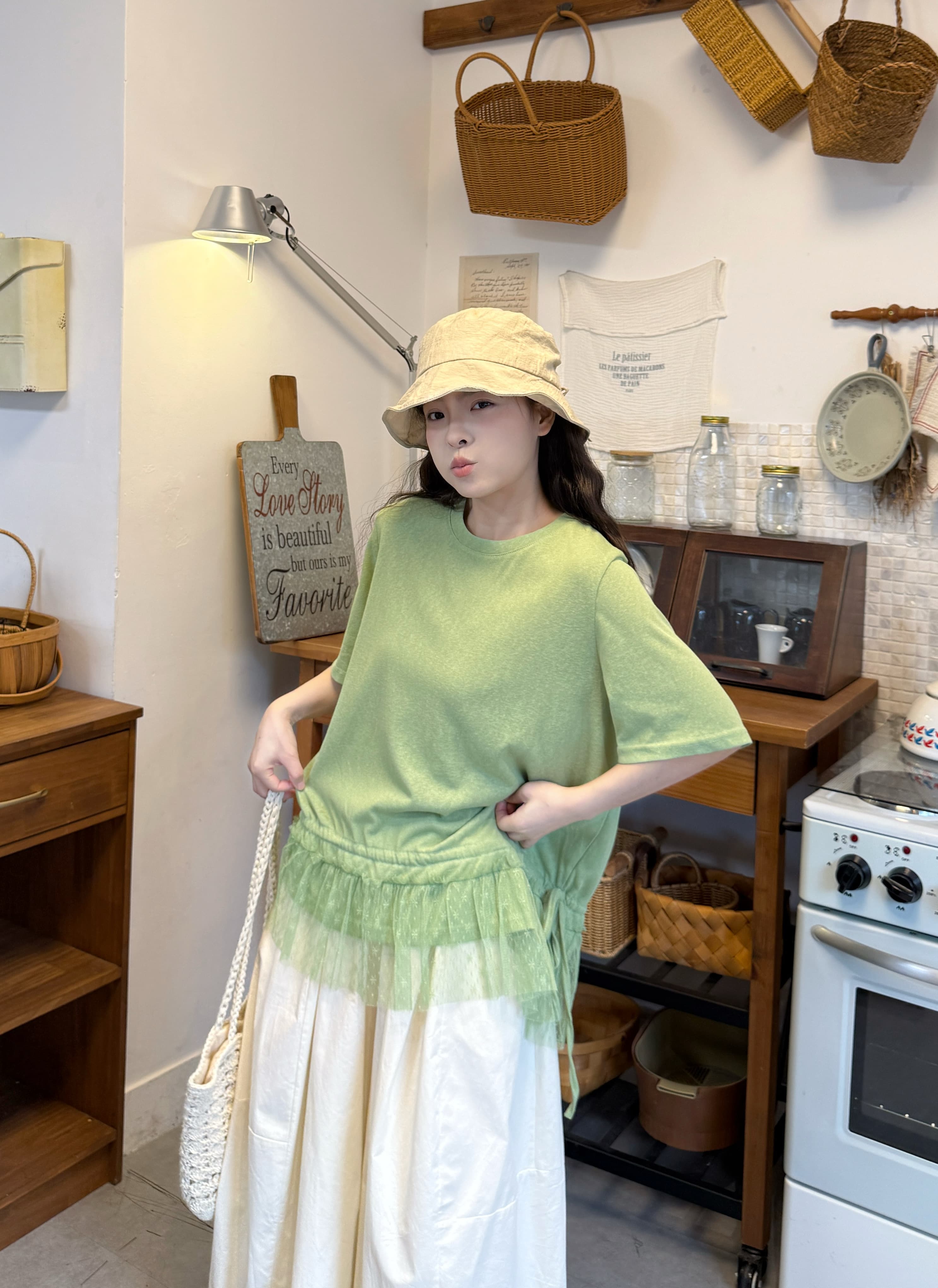실사 반팔 티셔츠 스택 착용 자수 블라우스 반신 스커트