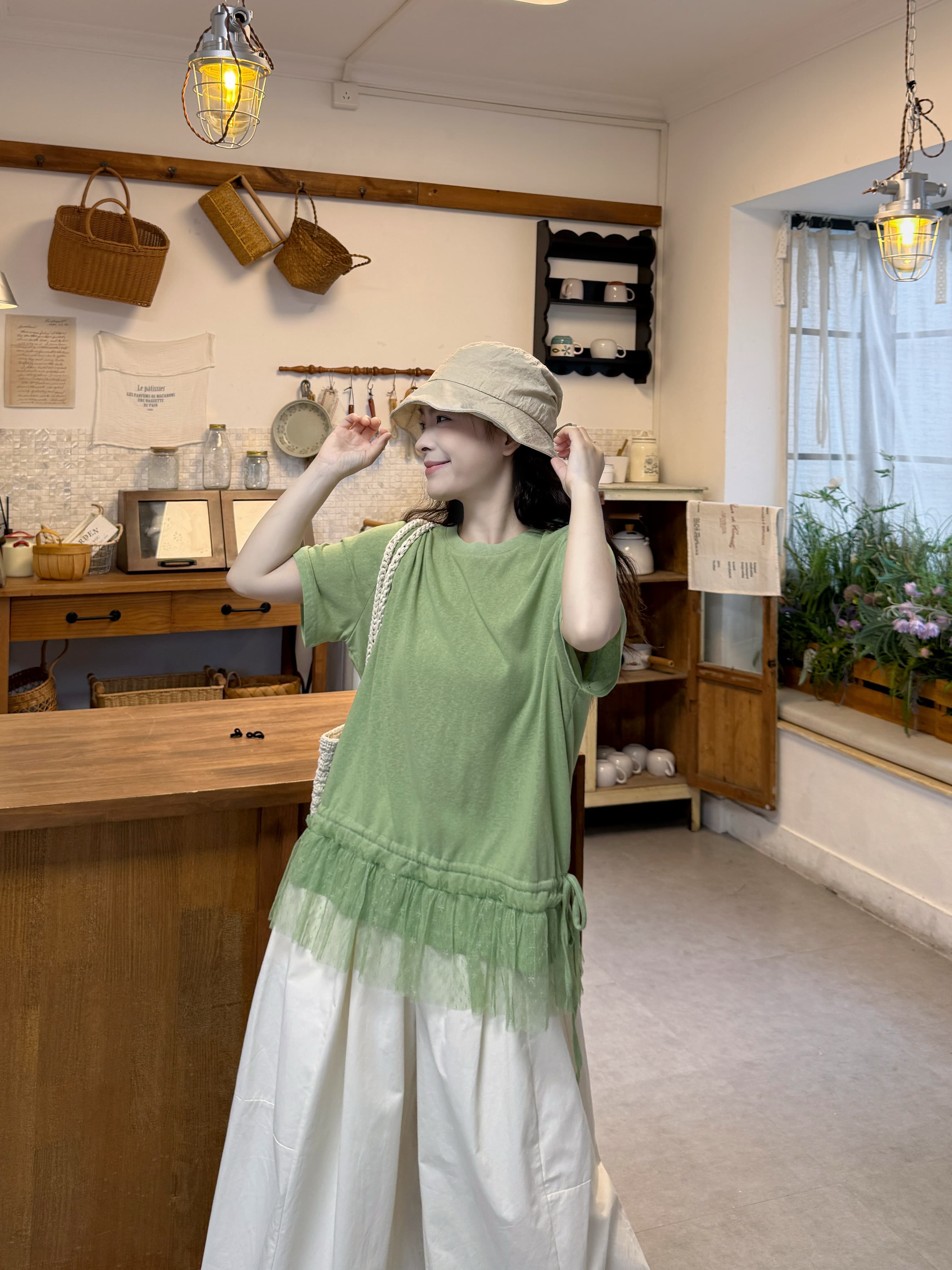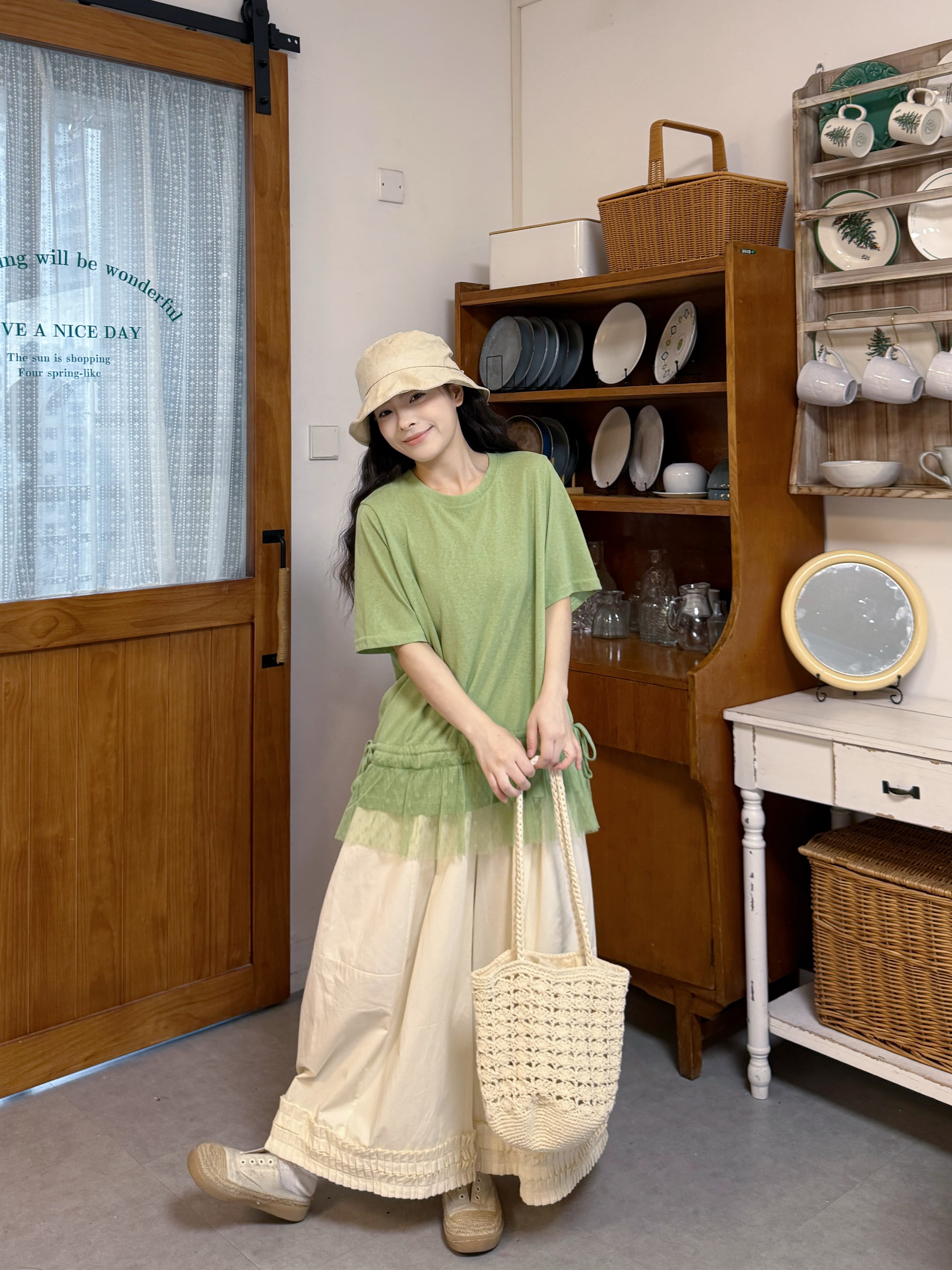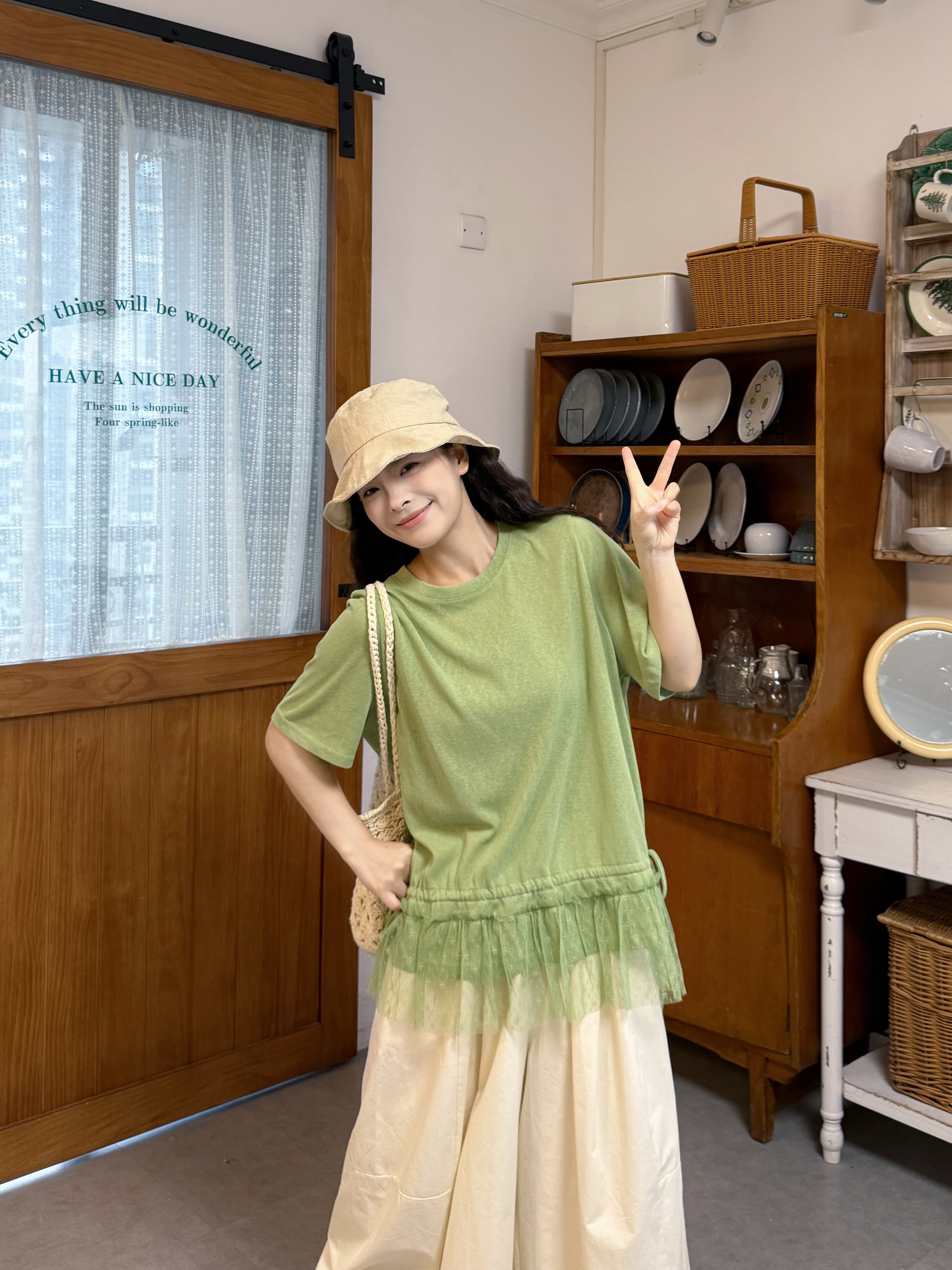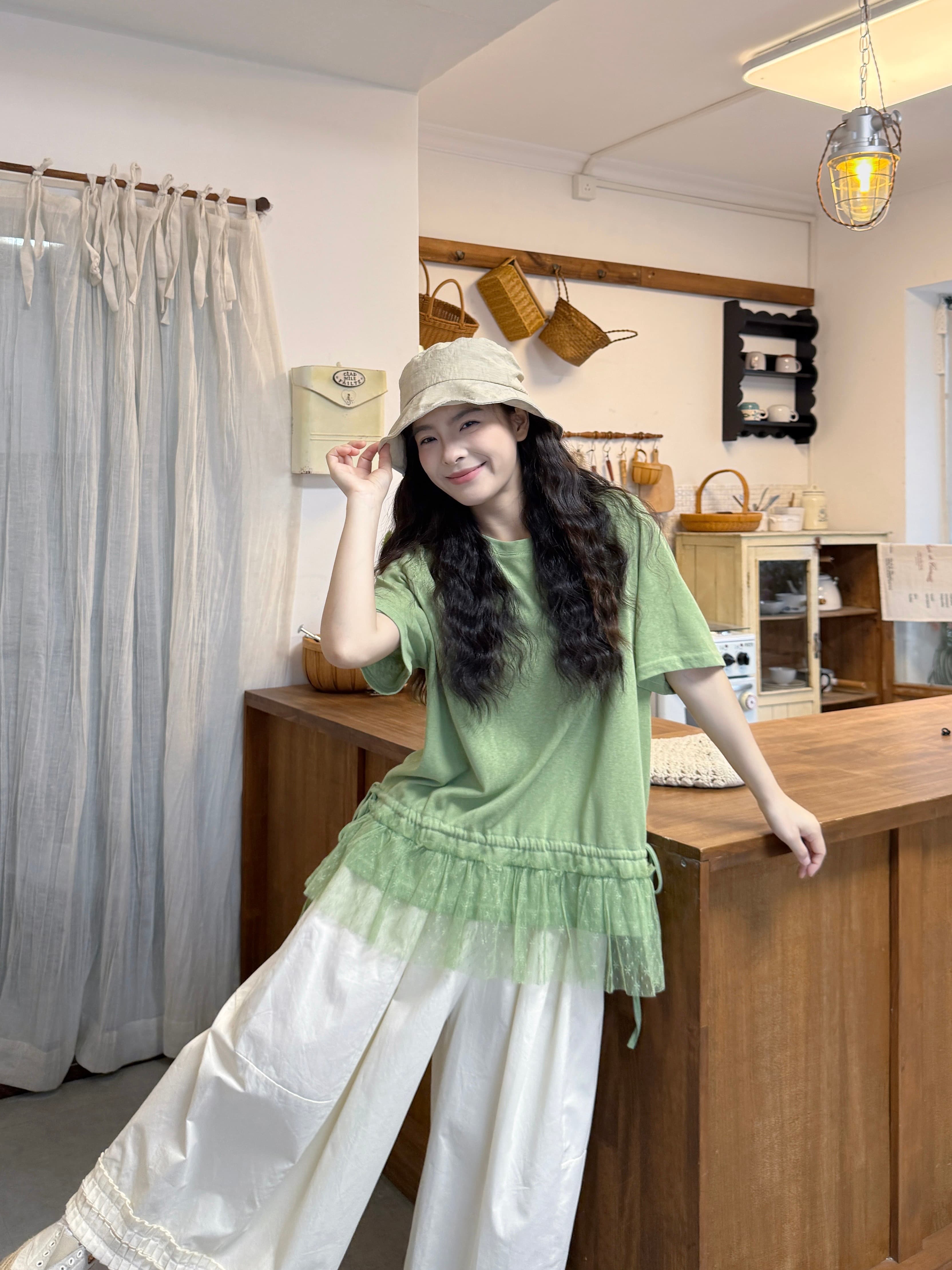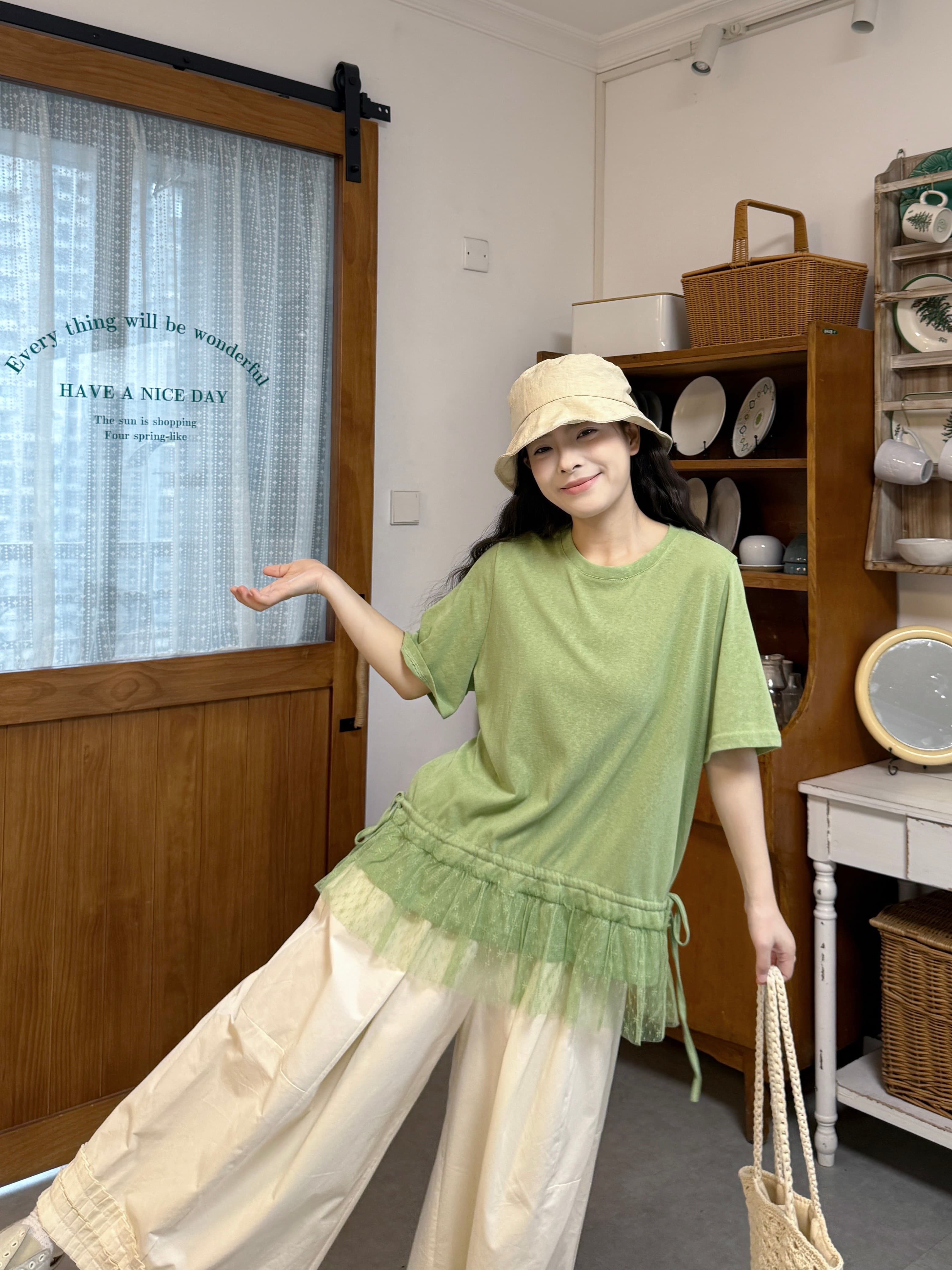 실사 레이스 밑단 반팔 티셔츠 바지