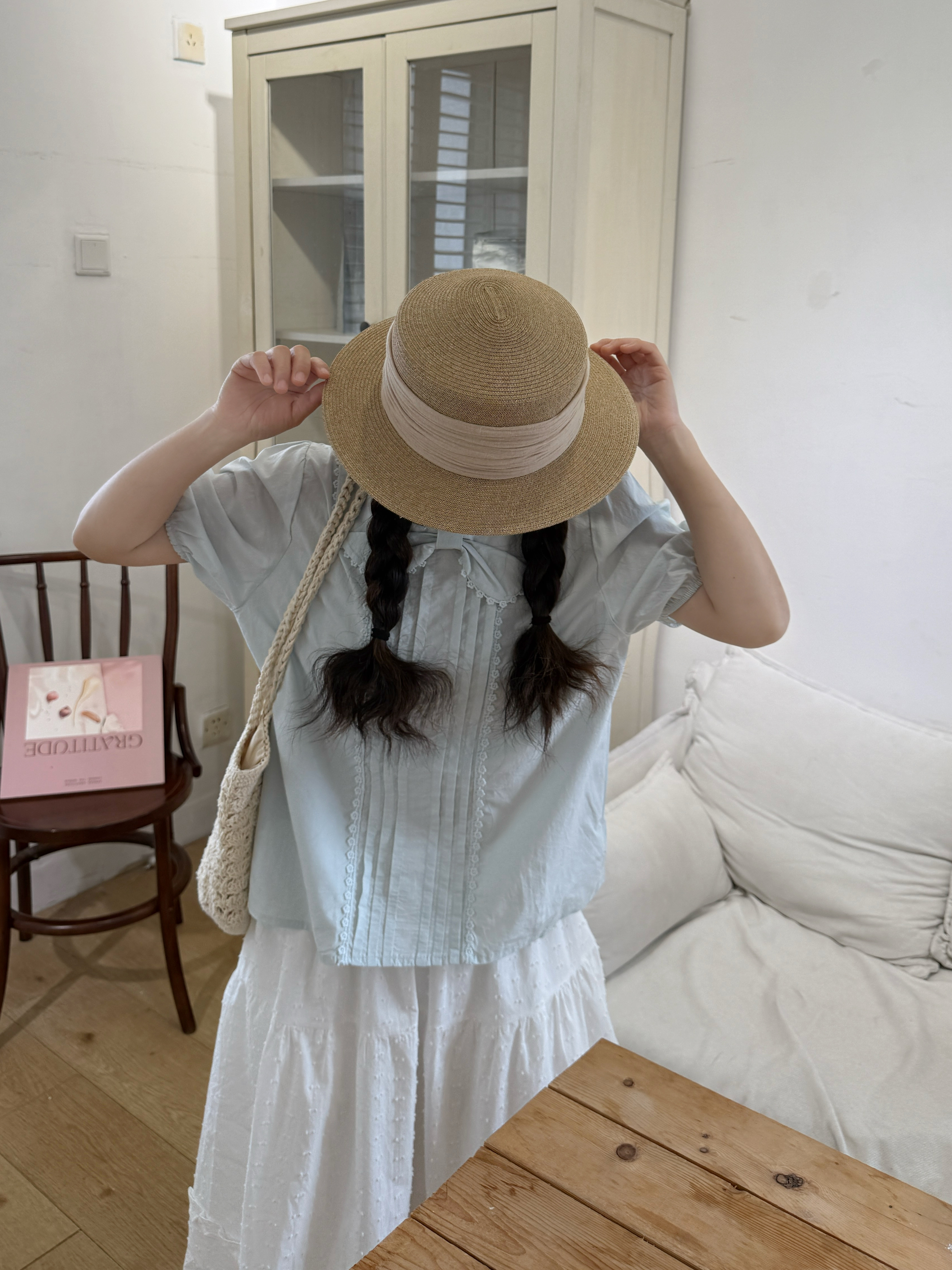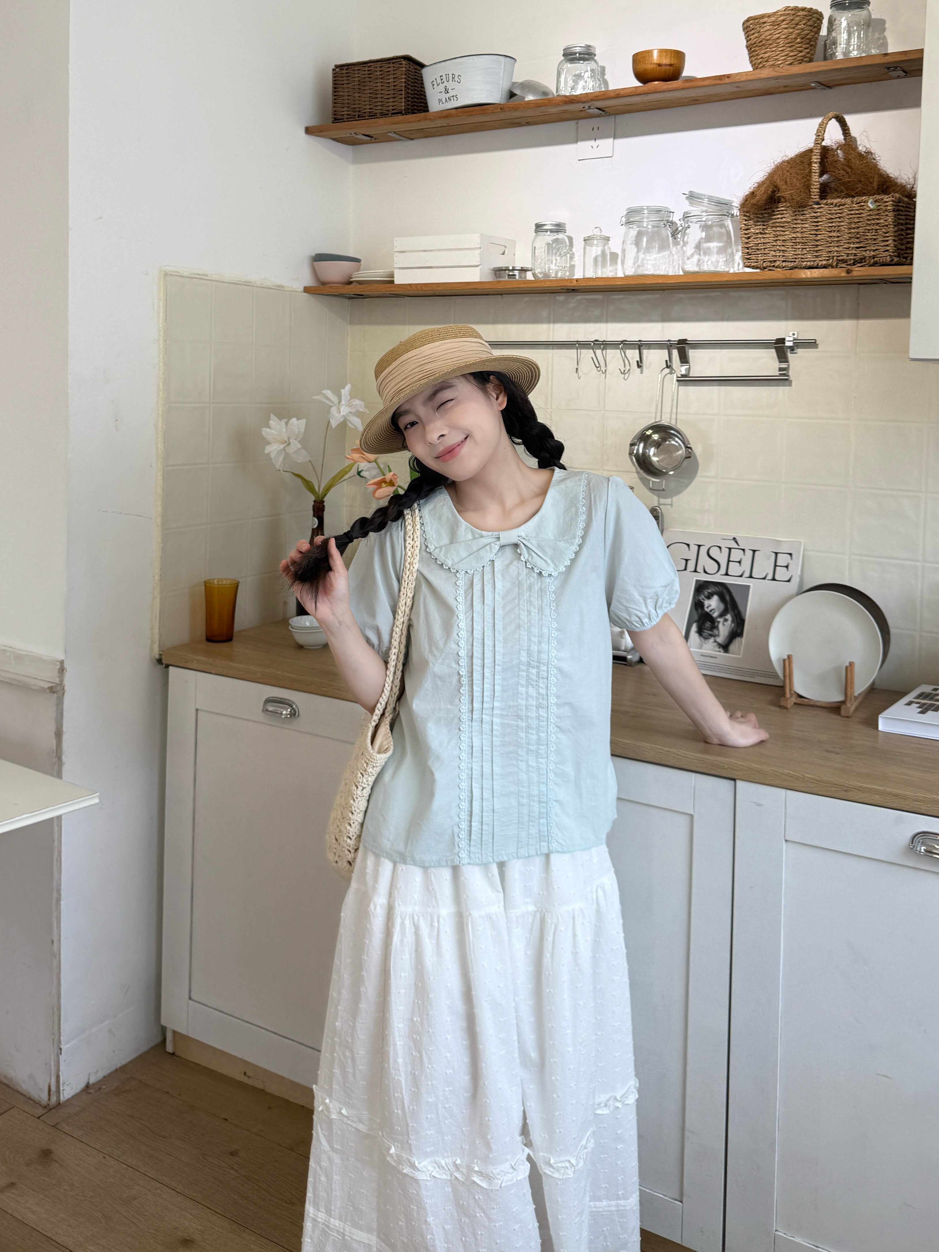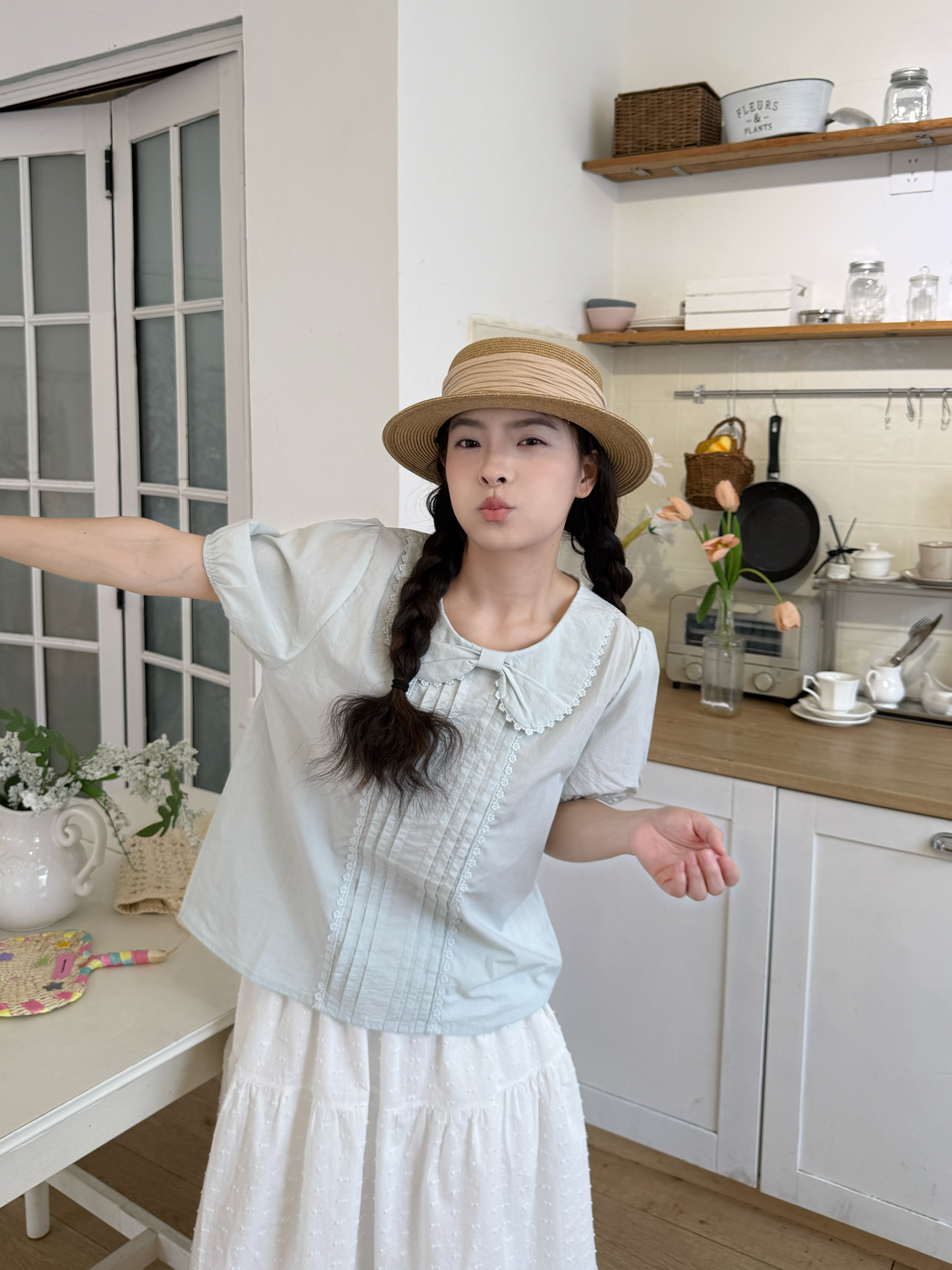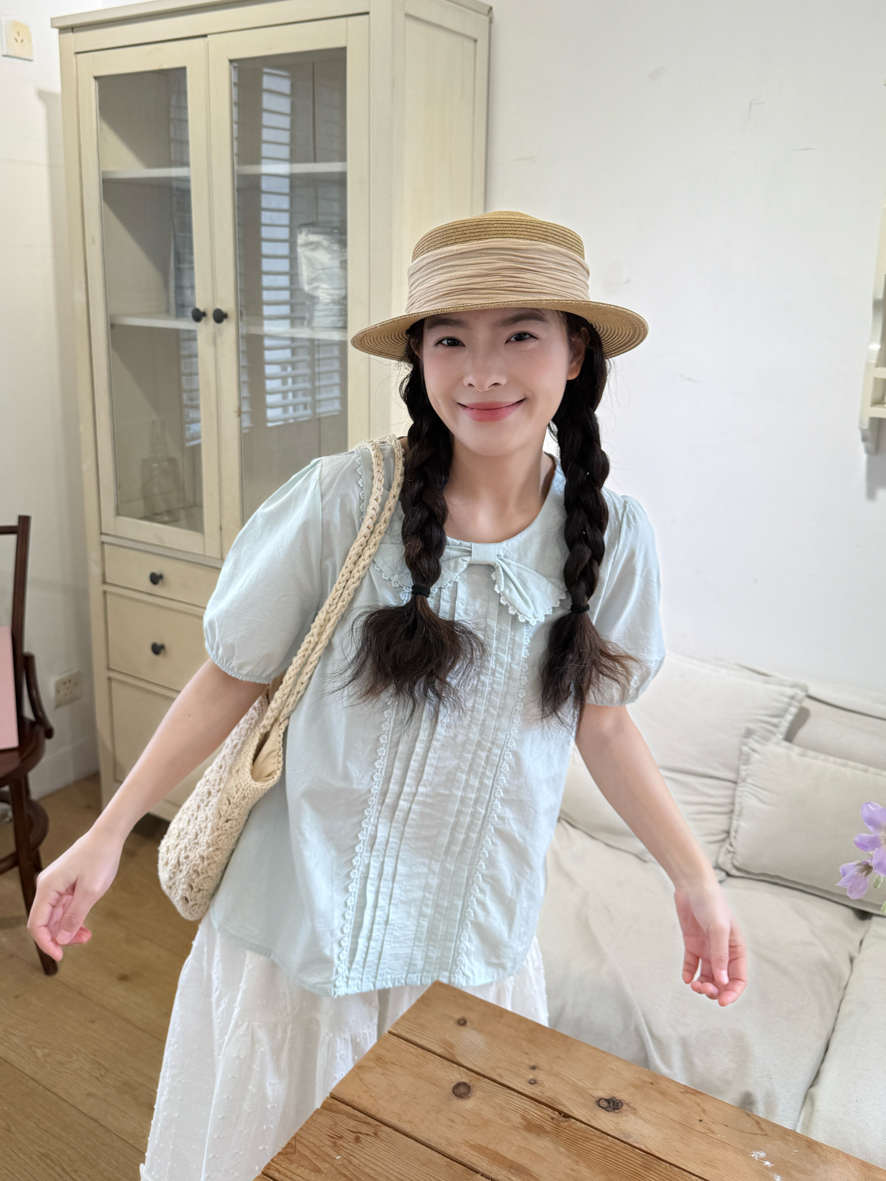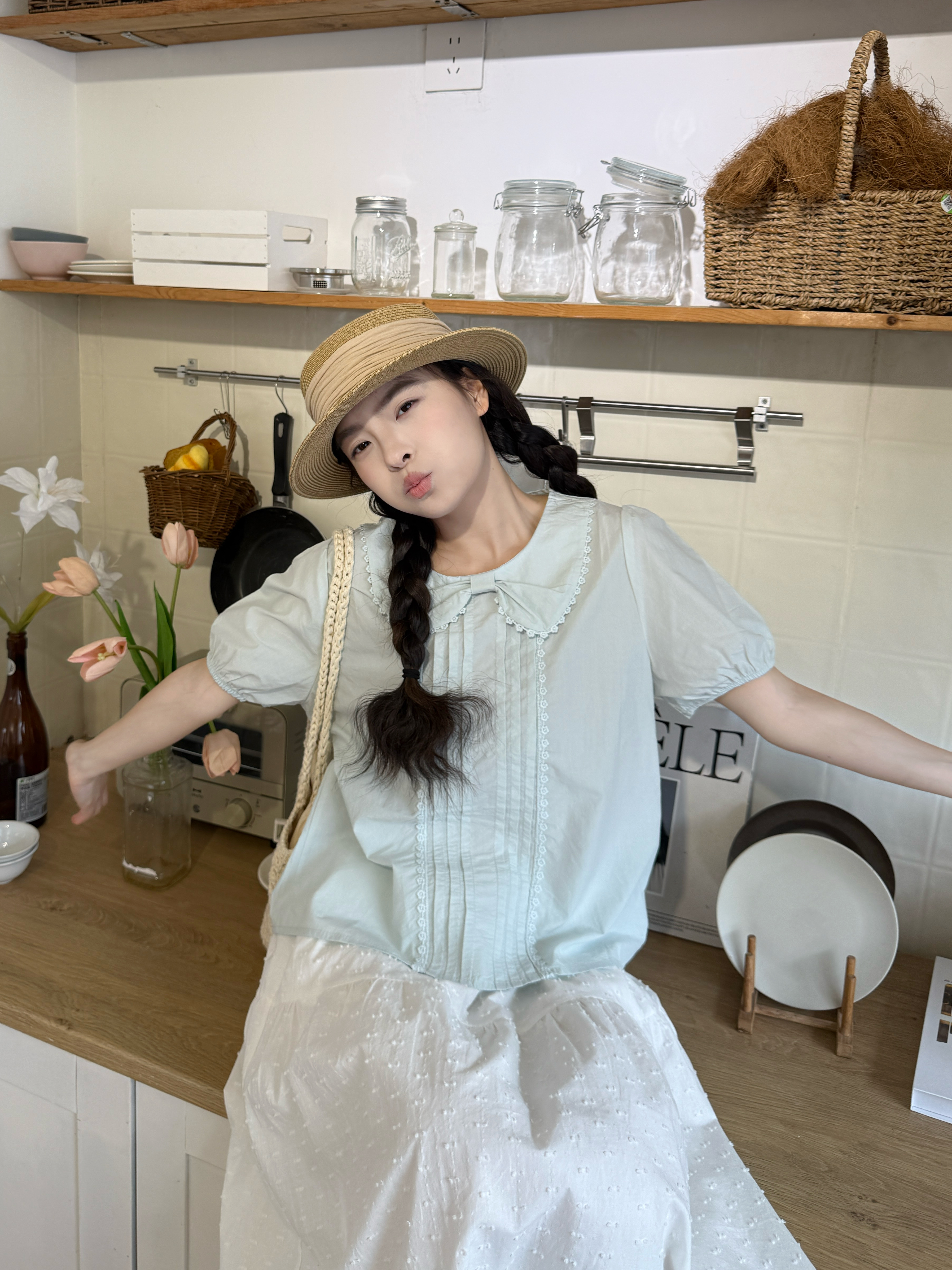 실사 레이스 베이비 칼라 루즈핏 반팔 셔츠