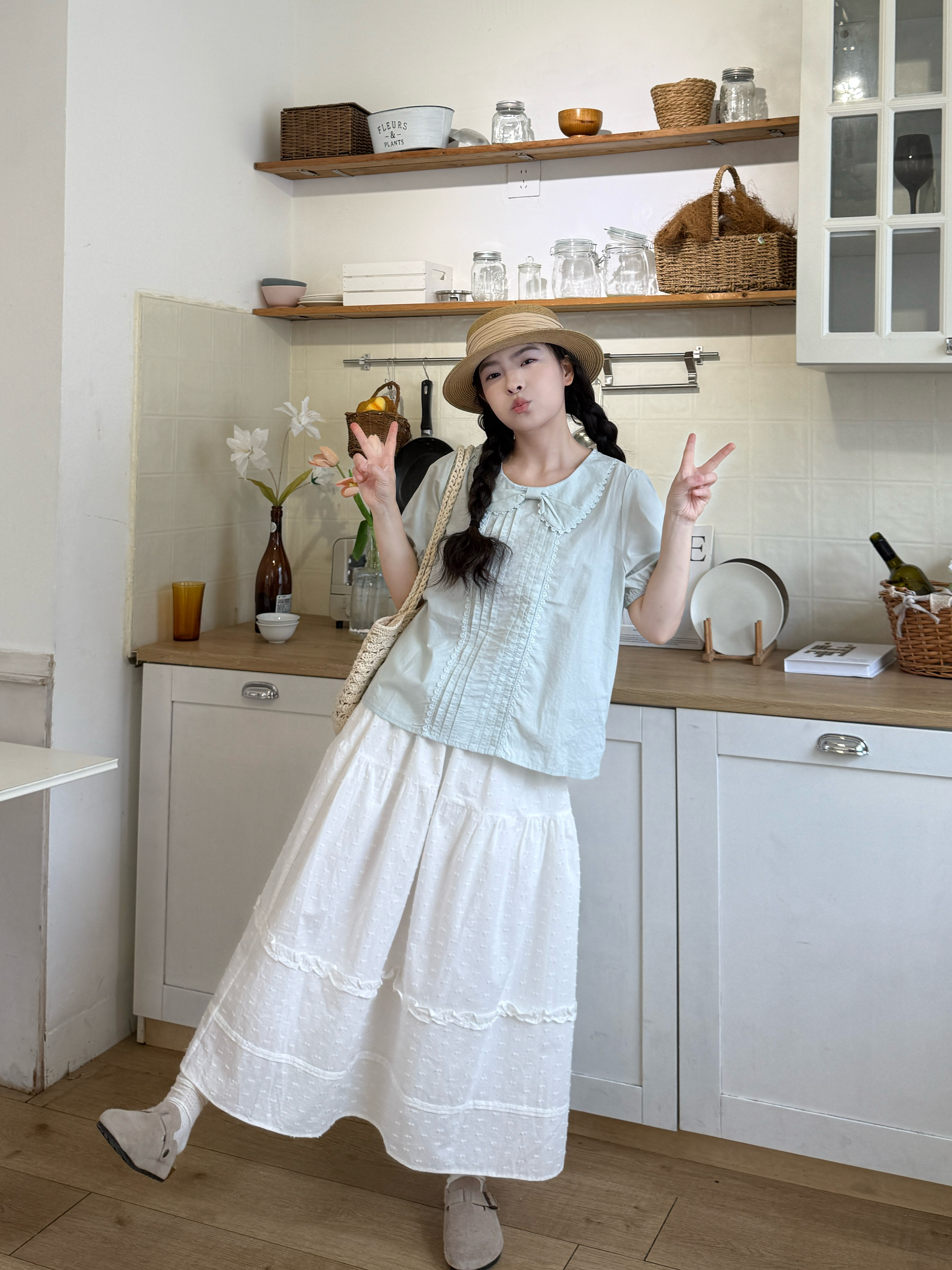 실사 반팔 티셔츠 스택 착용 자수 블라우스 반신 스커트