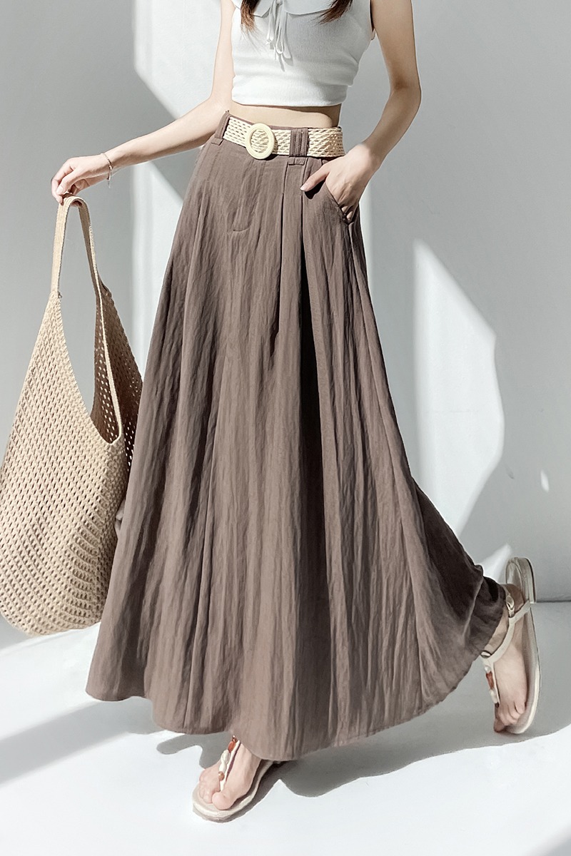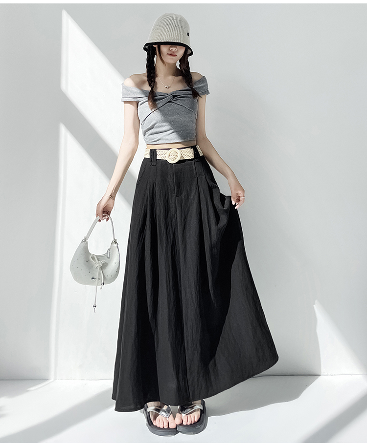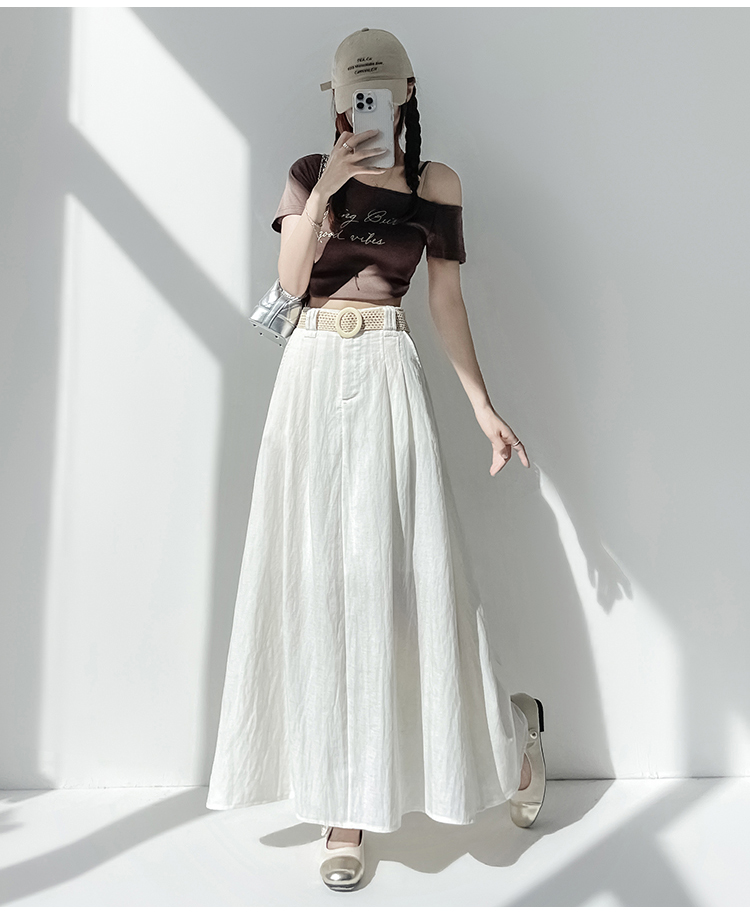 실사 2026 여름 한 부서 미니멀리즘 표지 넓적 다리 슬림해 보이는 짜임 벨트 디자인 중간 길이 면 린넨 한 마디 반신 스커트 우산 치마