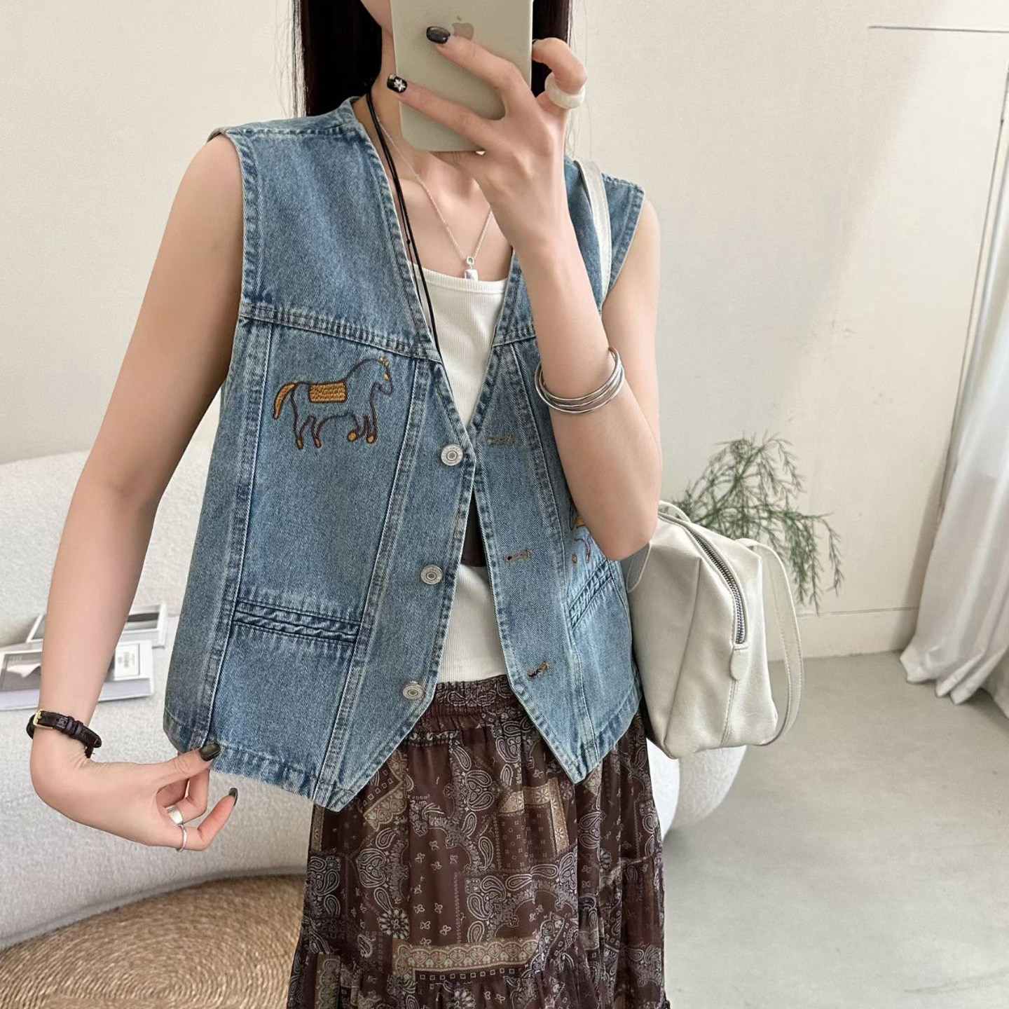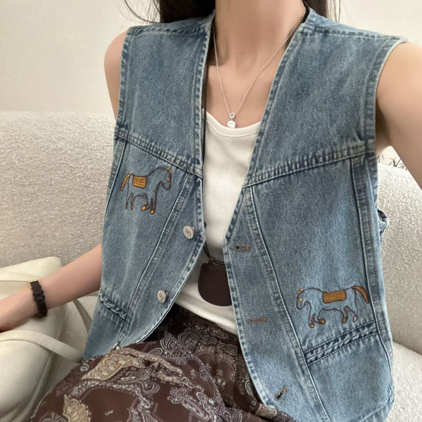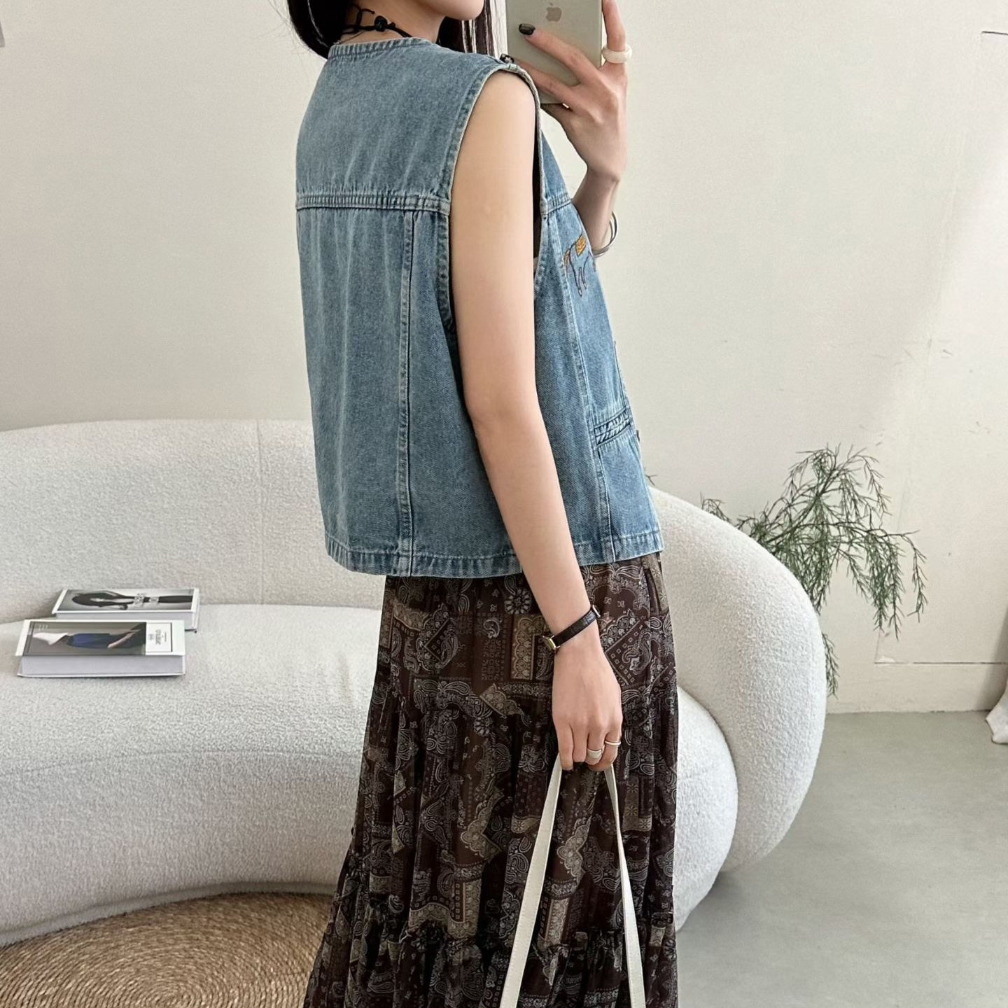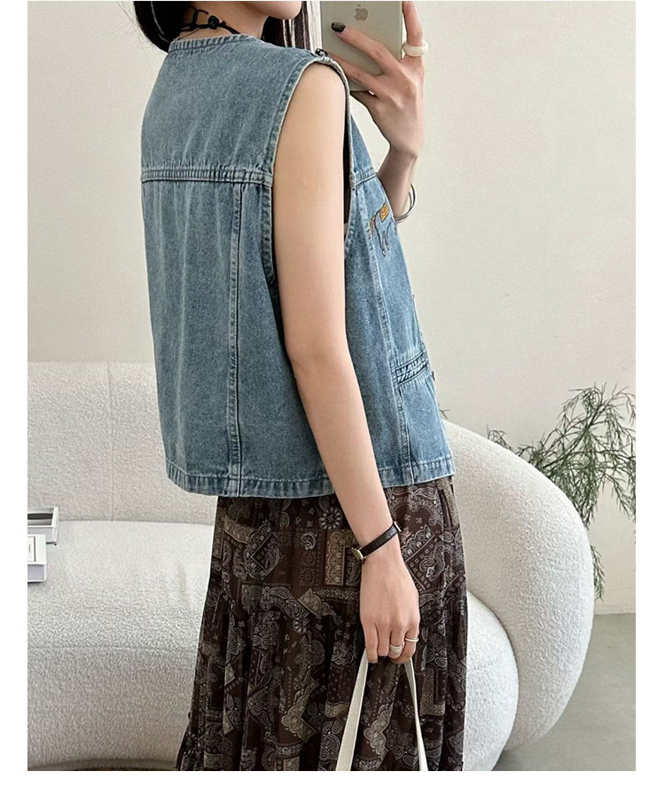 무거운 작업 자수 데님 조끼 여자 봄 드레스 새로운 자이언트 잘 생긴 라운드 넥 민소매 쇼트 스타일 어깨 조끼 스택 착용 조끼