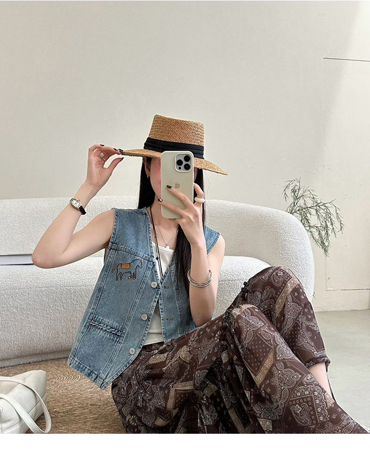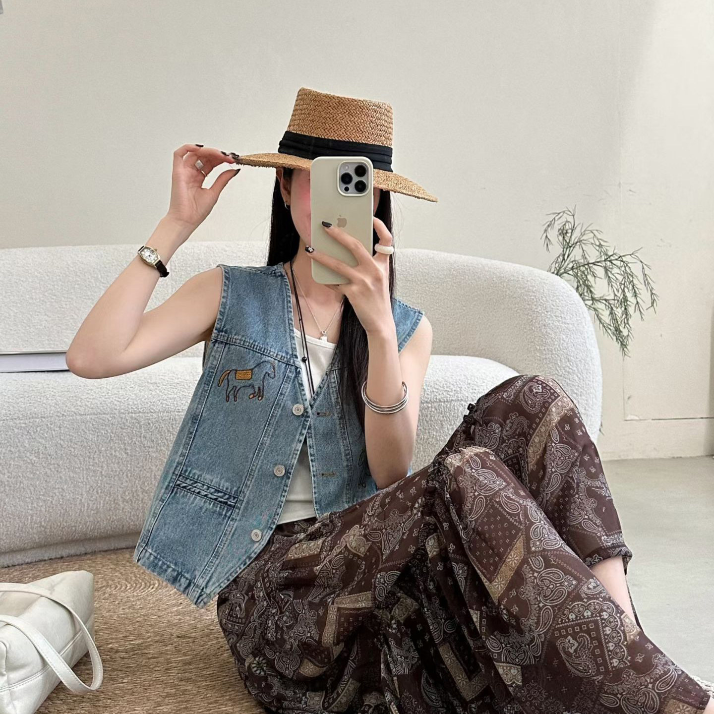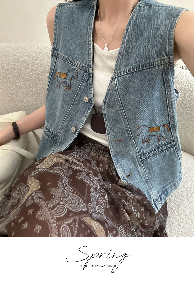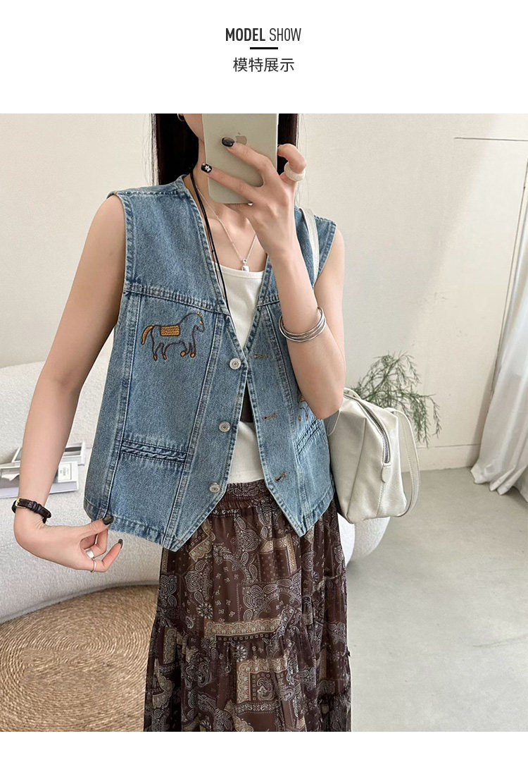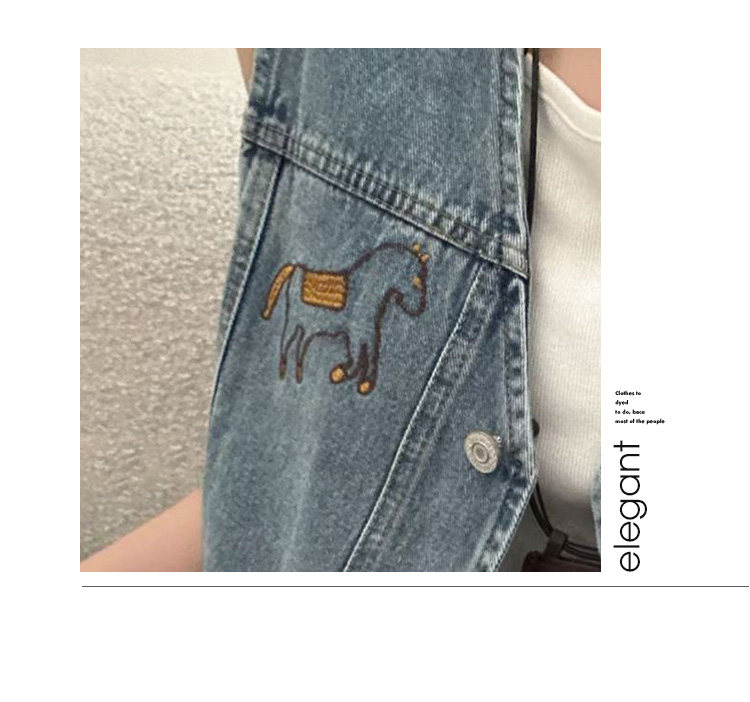 무거운 작업 자수 데님 조끼 여자 봄 드레스 새로운 자이언트 잘 생긴 라운드 넥 민소매 쇼트 스타일 어깨 조끼 스택 착용 조끼