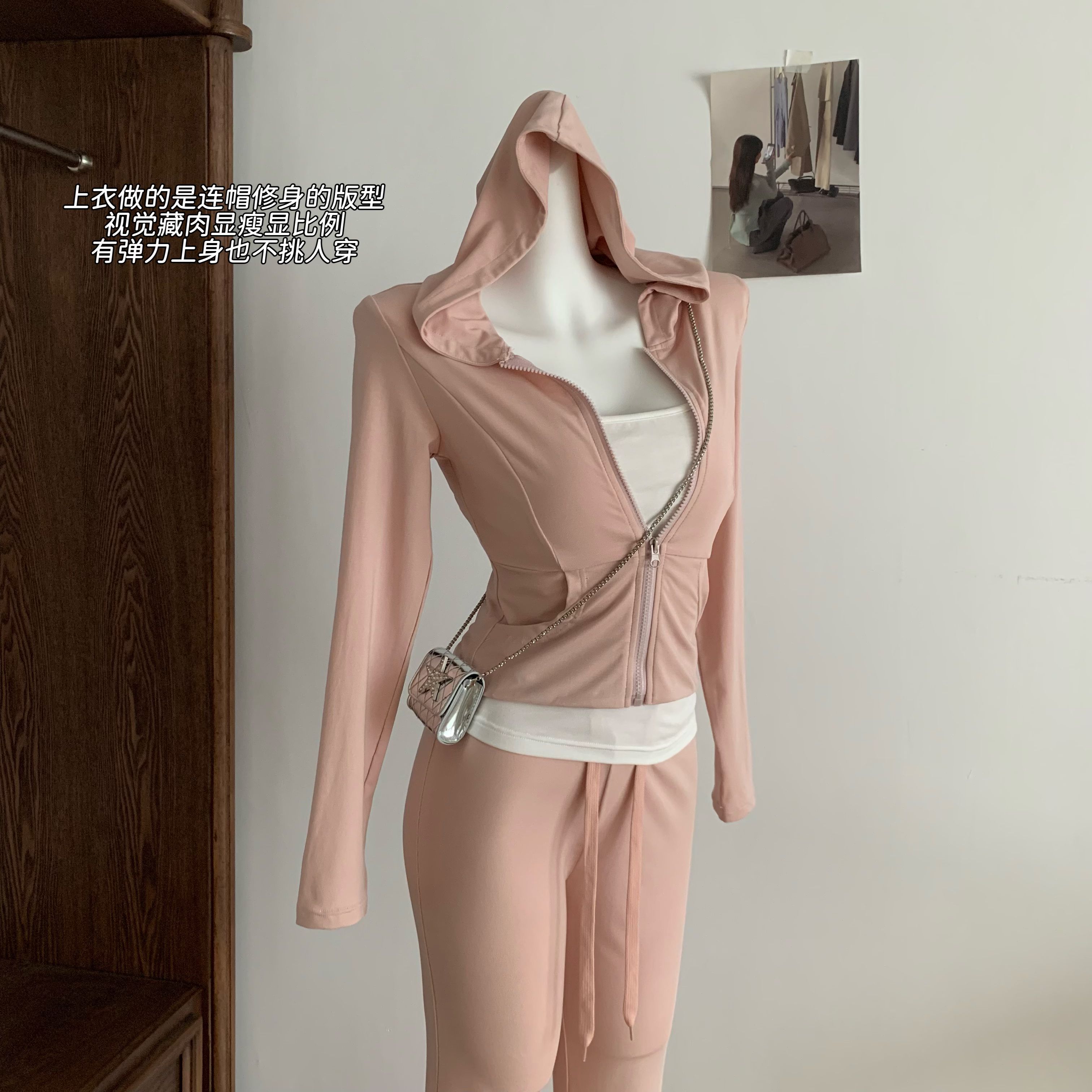 한 비 지아 화이트 여성 일상 두꺼운 가슴 패드 슬립 후드 니트 재킷 운동 긴 바지 세트