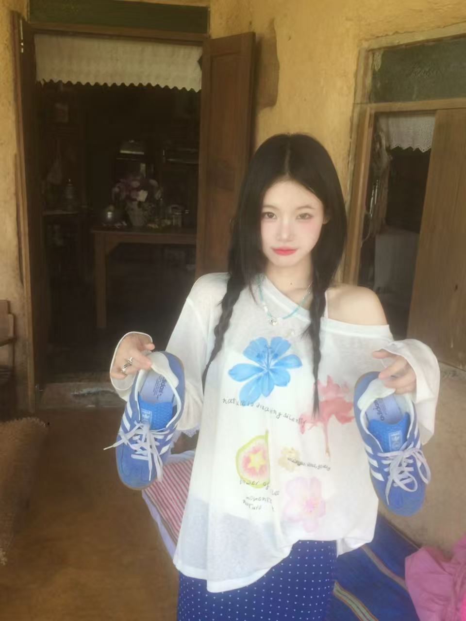 자외선 차단 블라우스 여성 2026 새로운 여름 착용 가져 가라. 한 부서 긴팔 티셔츠 화이트 루즈핏 비스듬한 어깨 의류