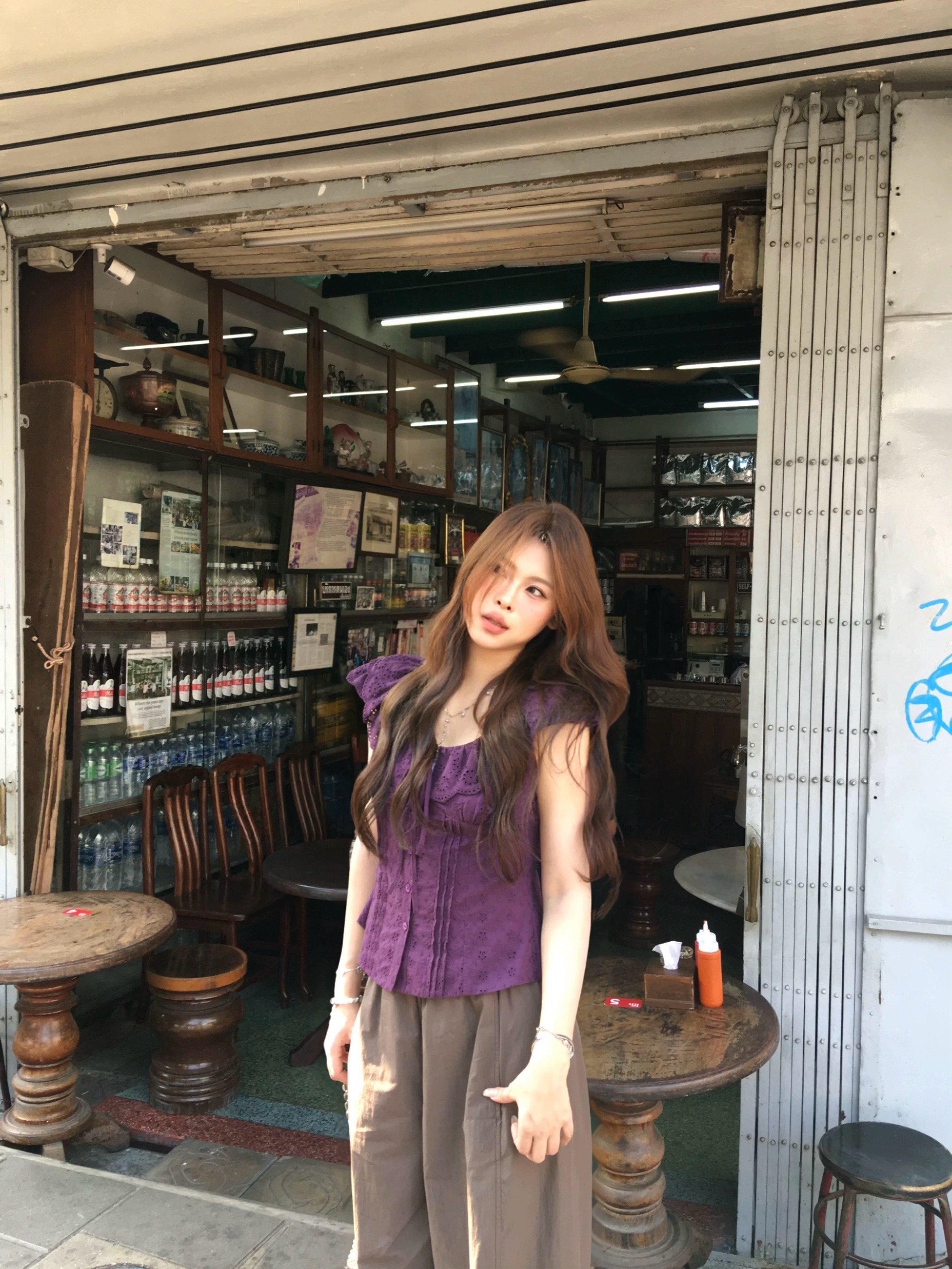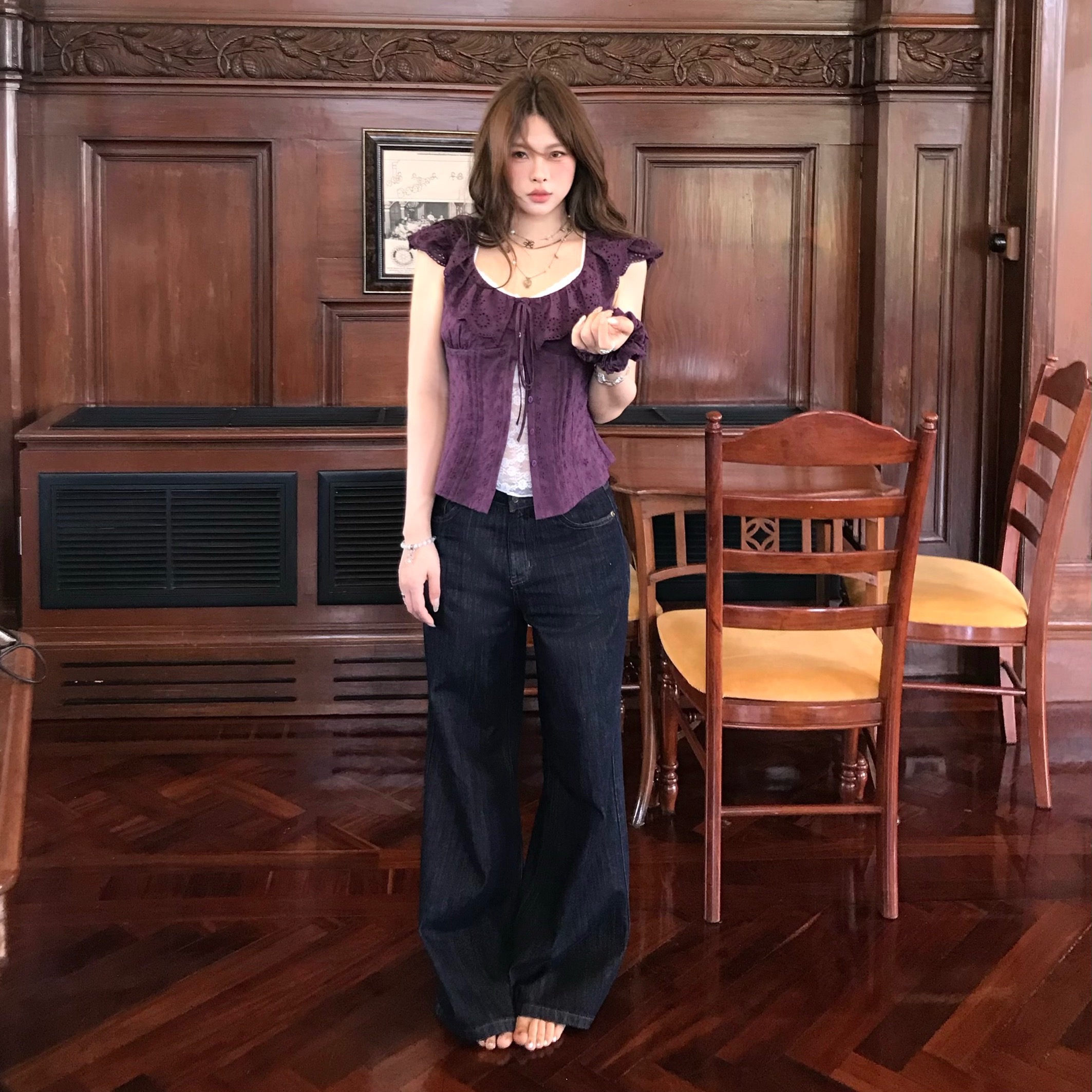 프랑스식 투피스 세트 보라색 레트로 셔츠 시스루 레이스 캐미솔 조끼 순수한 욕망 세트