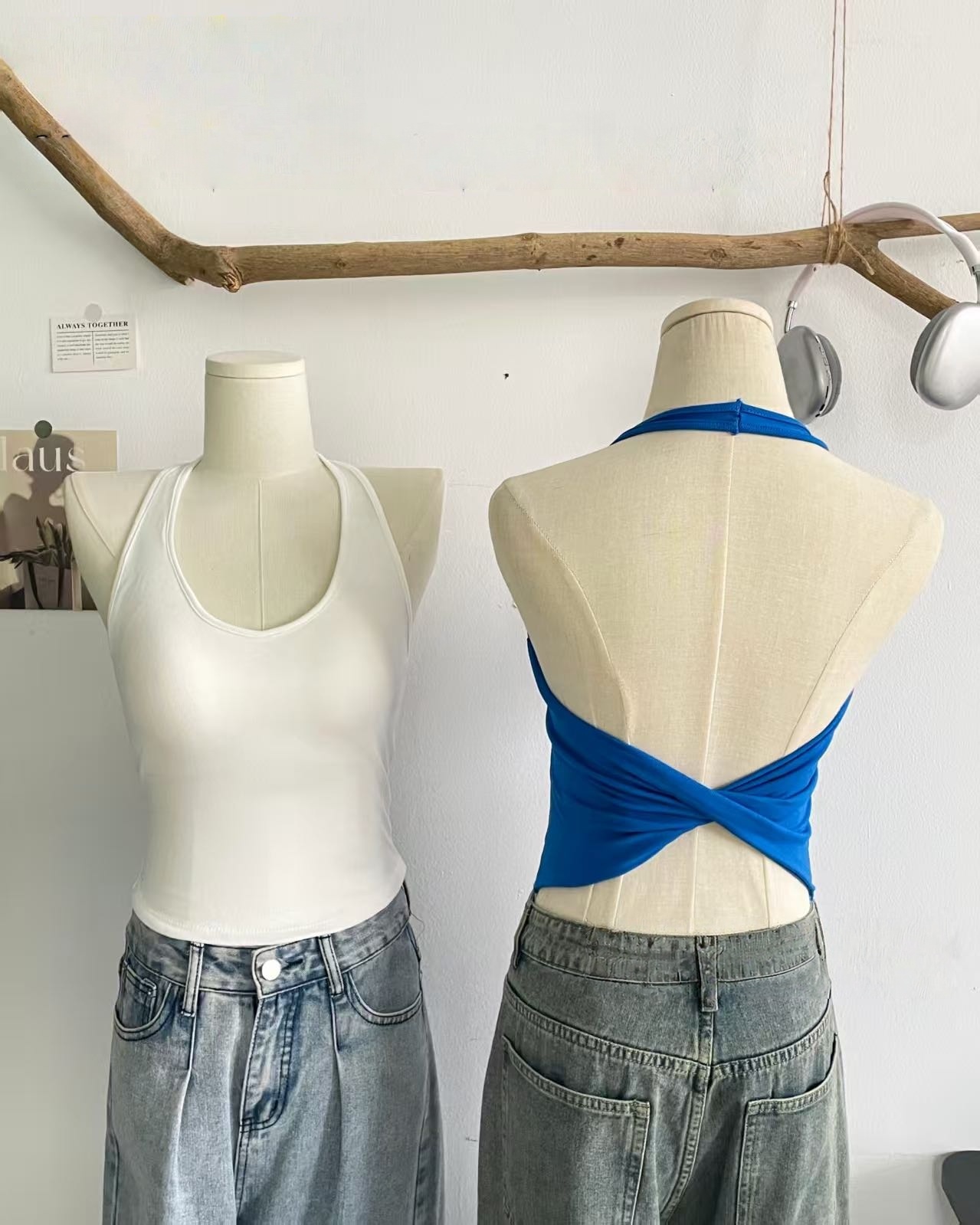 핫걸 바람 비틀림 대 백리스 행침 목 조끼 봄 여름 새로운 다용도 원피스 고정 컵 슬립