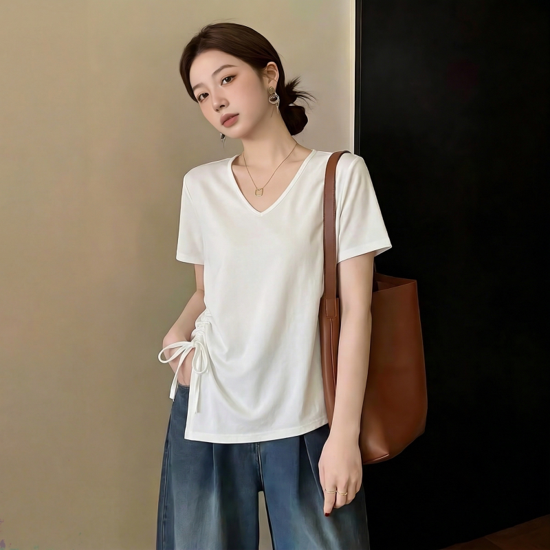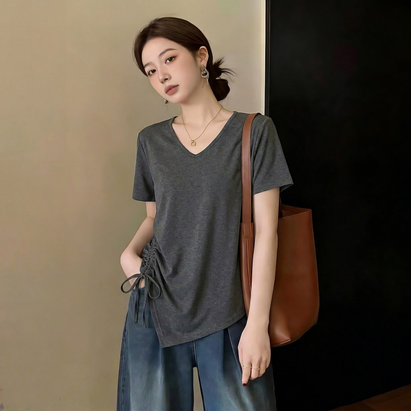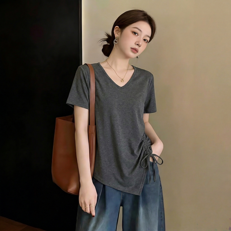 디자인 센스 V넥 긍정적 인 어깨 반팔 티셔츠 여성 2026 여름 새로운 지방 mm 고유 한 작은 셔츠 불규칙 펌프 로프 맨위