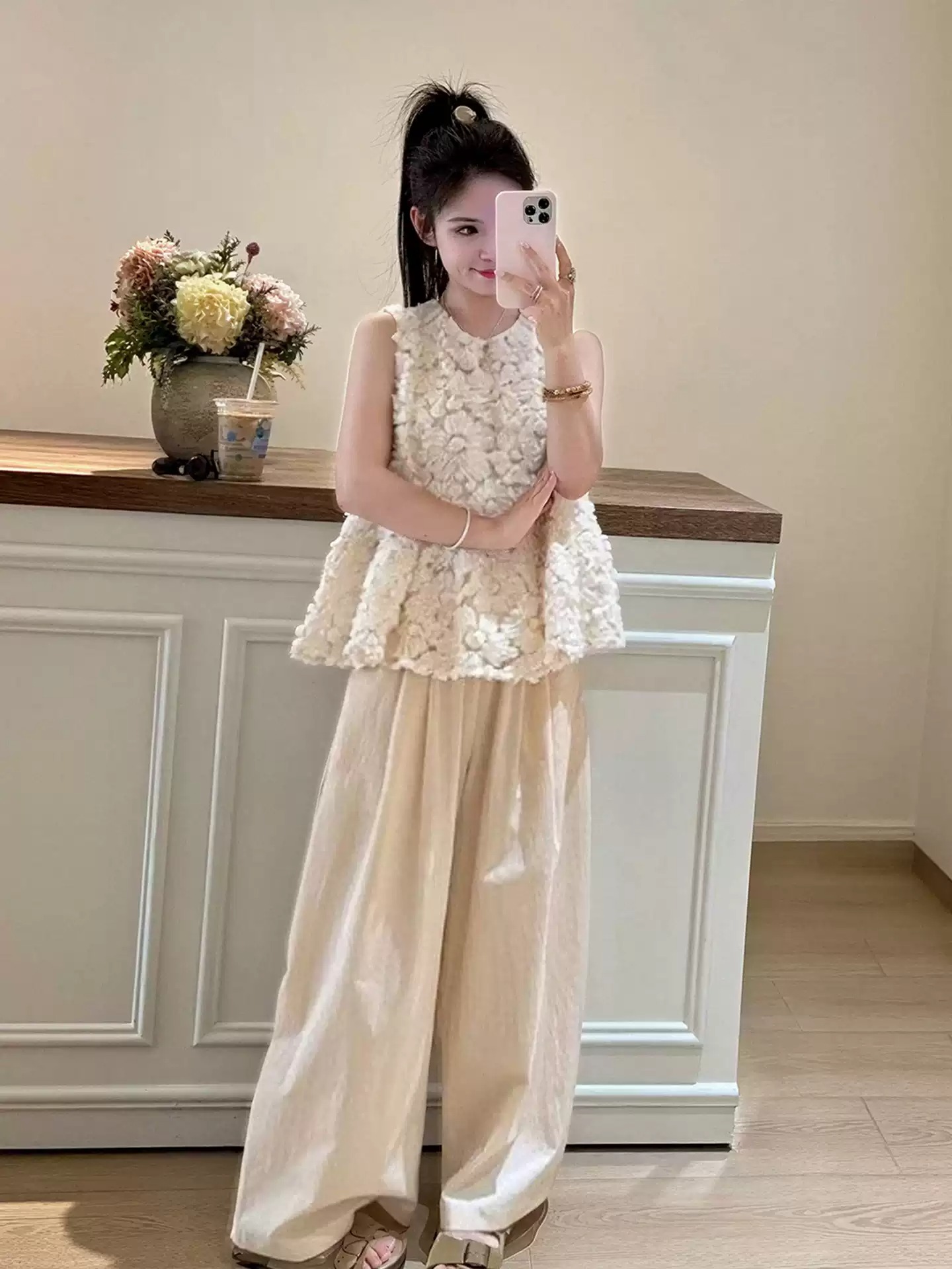 2026 여름 새로운 프랑스식 부드러운 바람 무거운 작업 3 차원 꽃 민소매 맨위 와이드 레그 팬츠 고급 센스 세트 여성