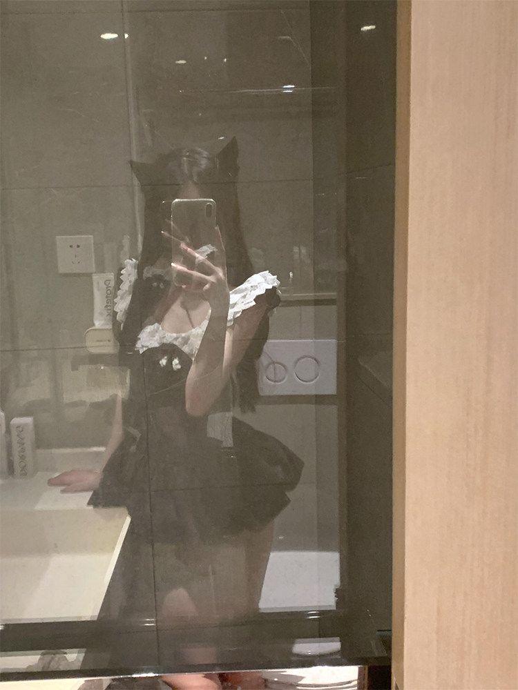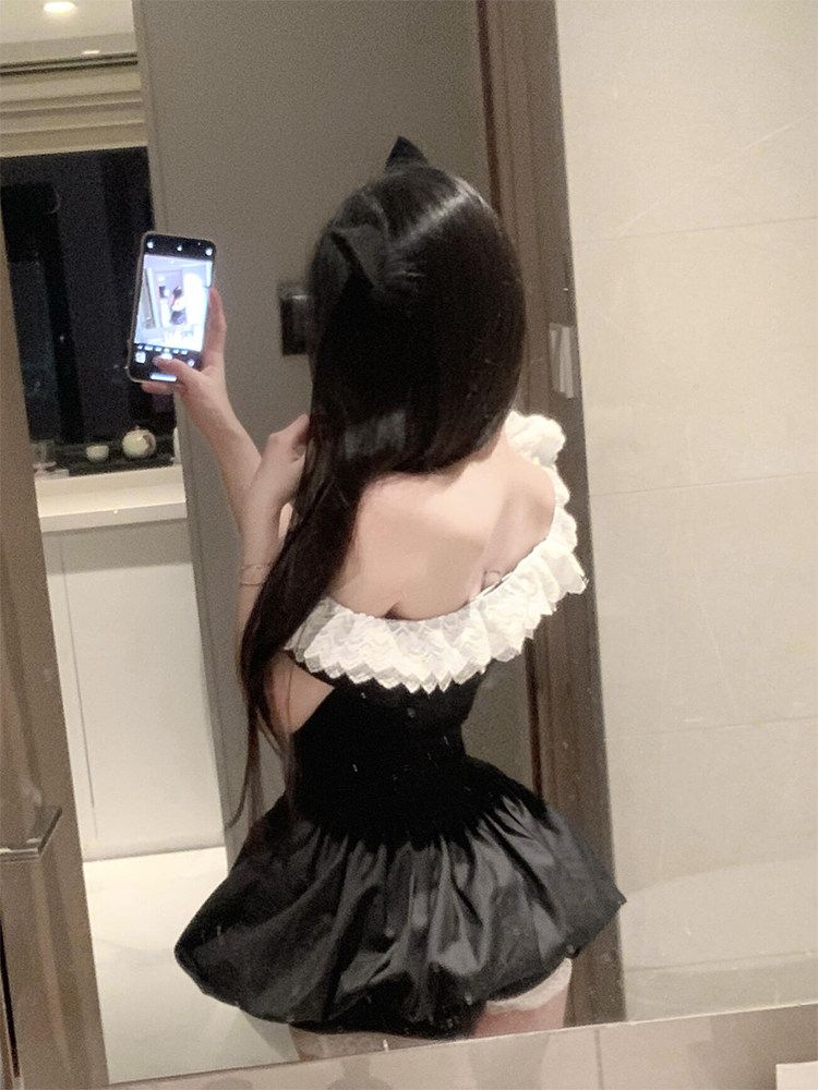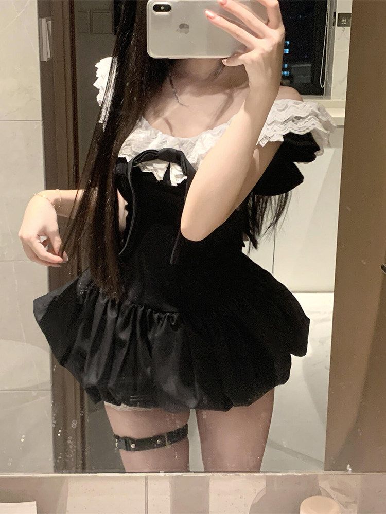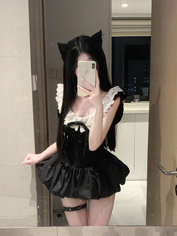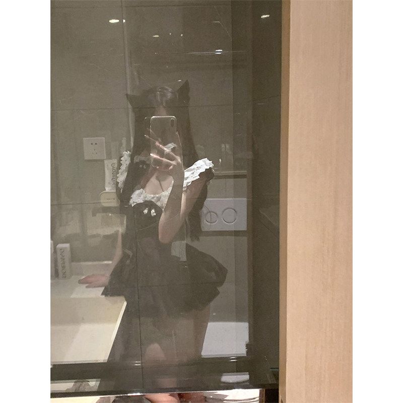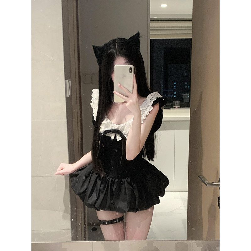 소녀 바람 숯 문화 여성 여름 투피스 슈트 나비 매듭 레이스 레이스 몸매 가꾸기 반팔 달콤한 차가운 케이크 드레스