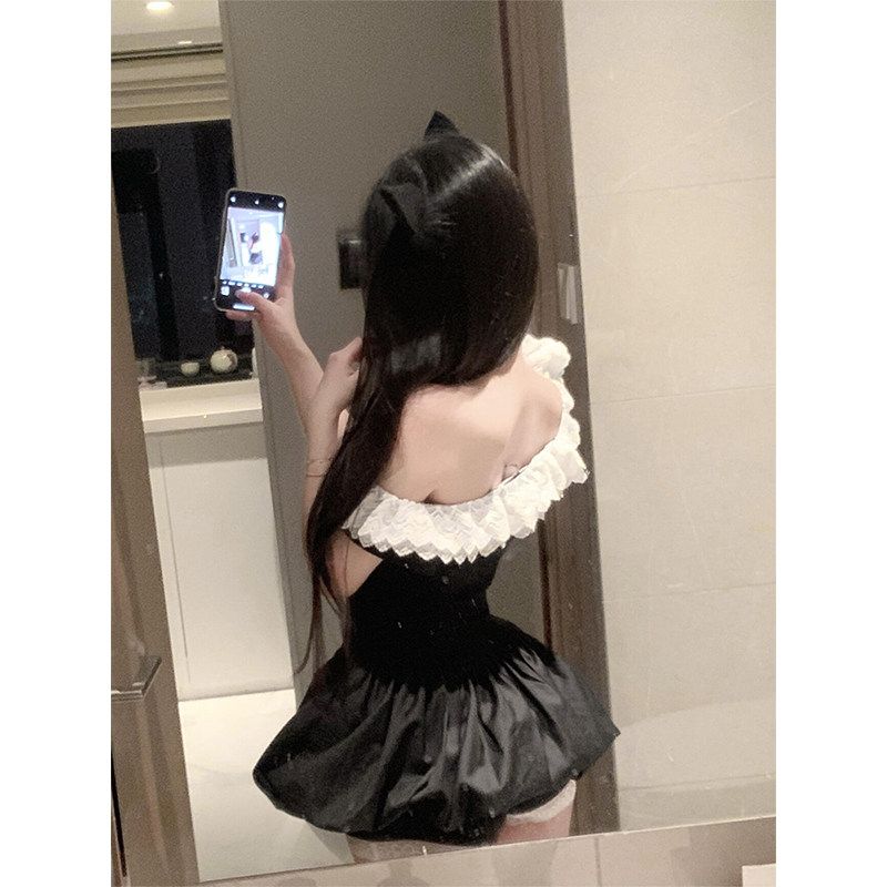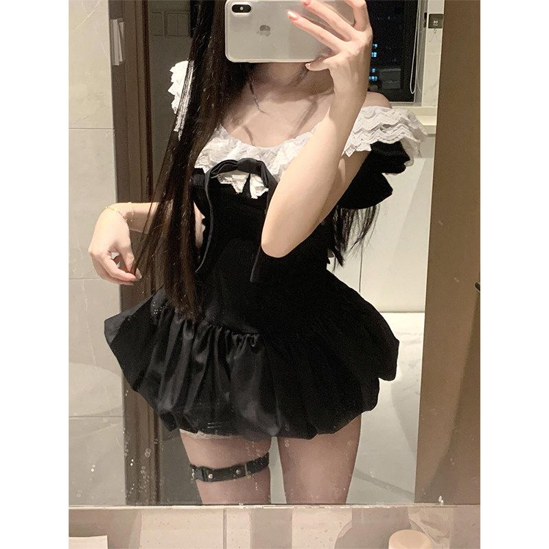 부유 한 가족 천 골드 센스 작은 검은 드레스 레이스 조각 오프숄더 여성 드레스 여름 허리 수축 슬림해 보이는 꽃밭 짧은 치마