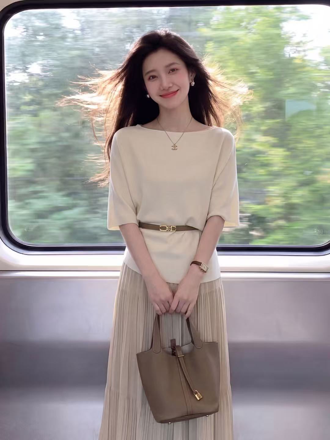 크림 살구 니트 세트 부드러운 바람 맨위 하이웨이스트 큰 진자 반신 스커트