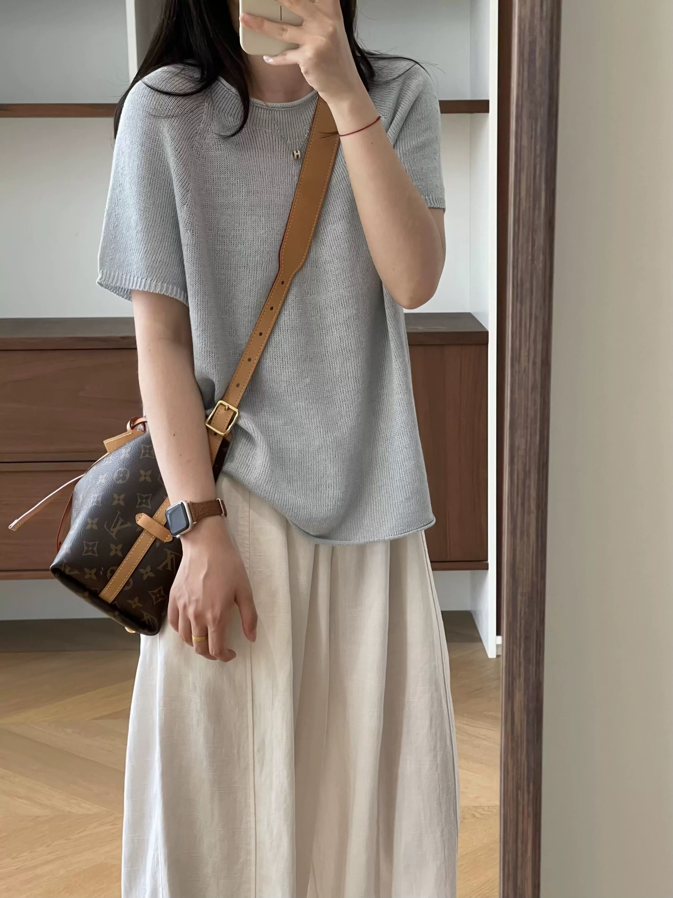 레트로 작은 대중 공정한 섬 니트 반팔 티셔츠 여성 여름 섹션 긍정적 인 어깨 몸매 가꾸기 얼음 실크 작은 키 쇼트 스타일 맨위