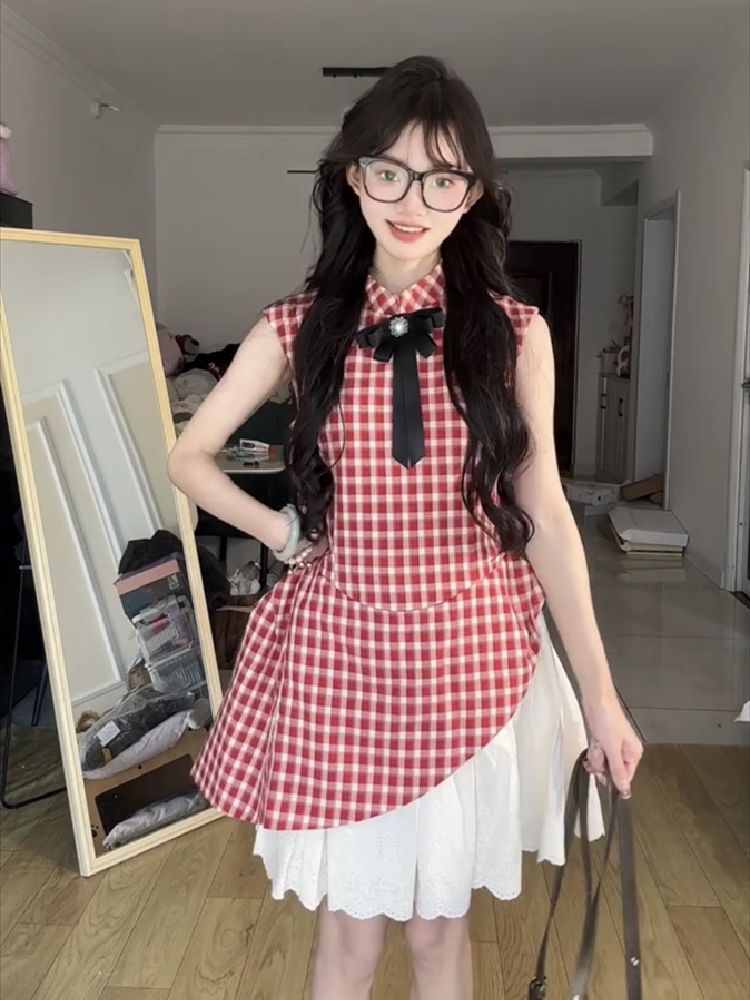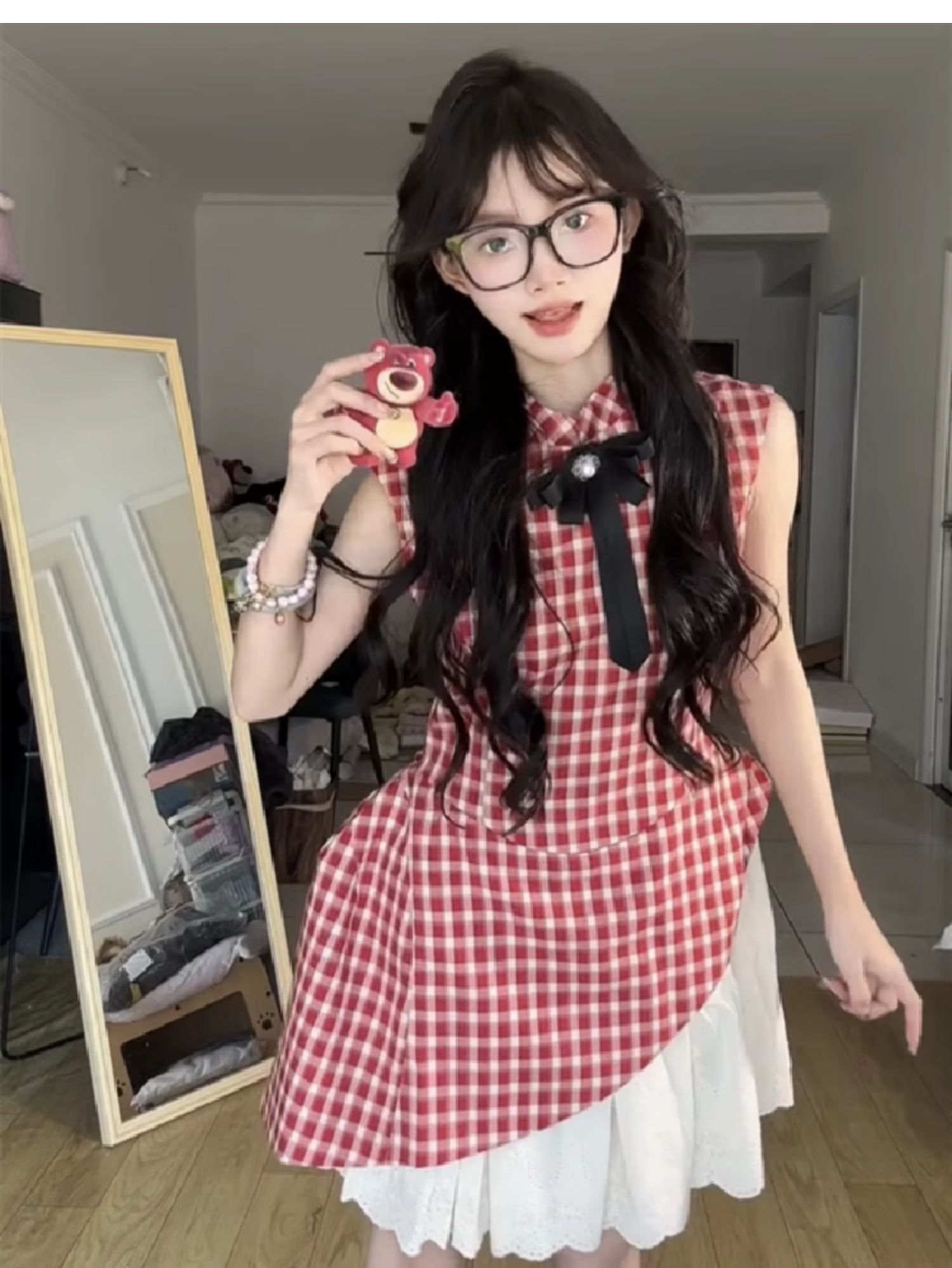학원 스타일 빨간색 체크무늬 케이크 퍼프 여성 드레스 생일 치마 달콤함 품격 허리 수축 슬림해 보이는 조끼 스커트